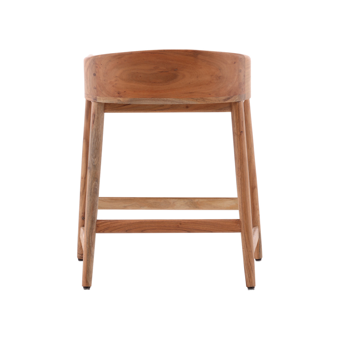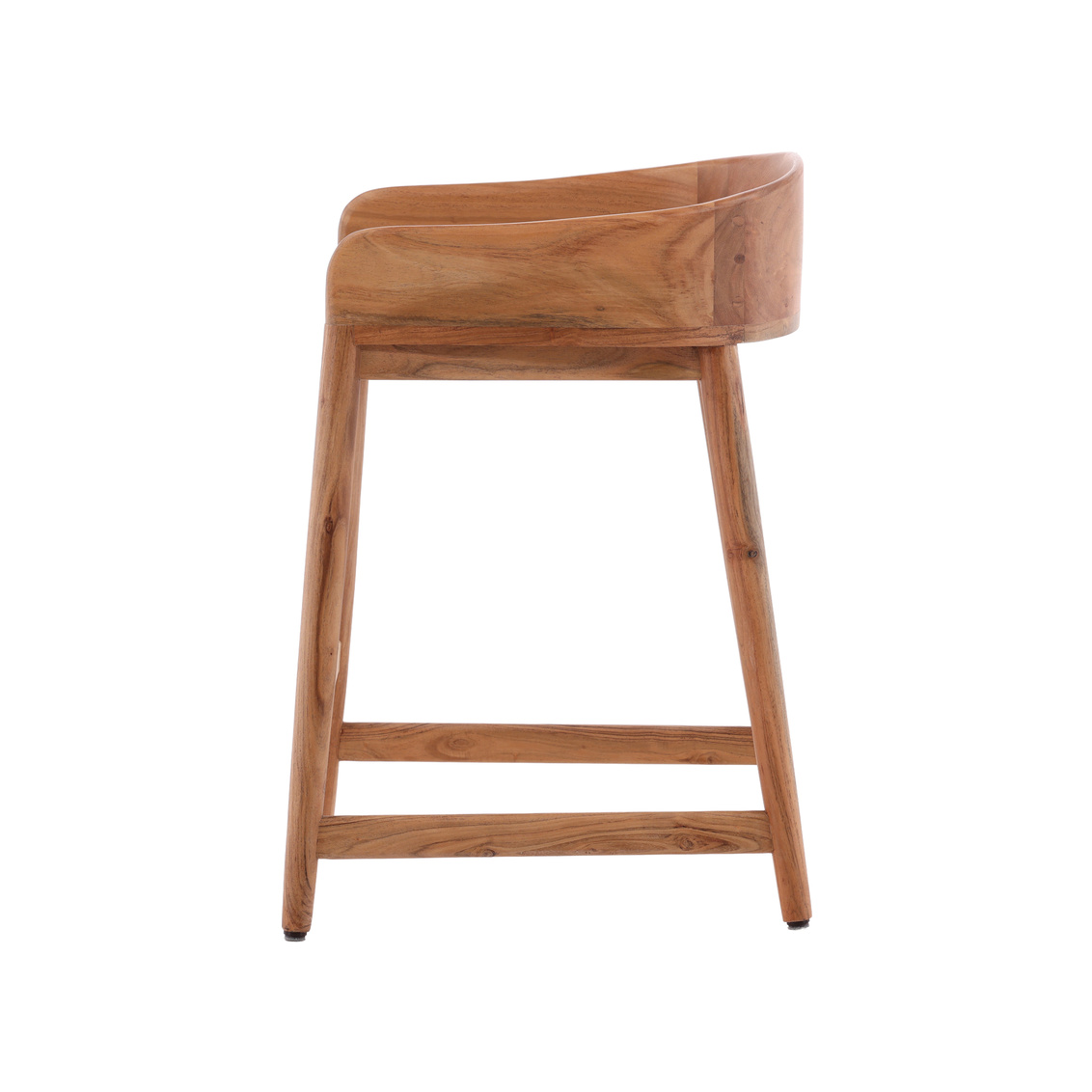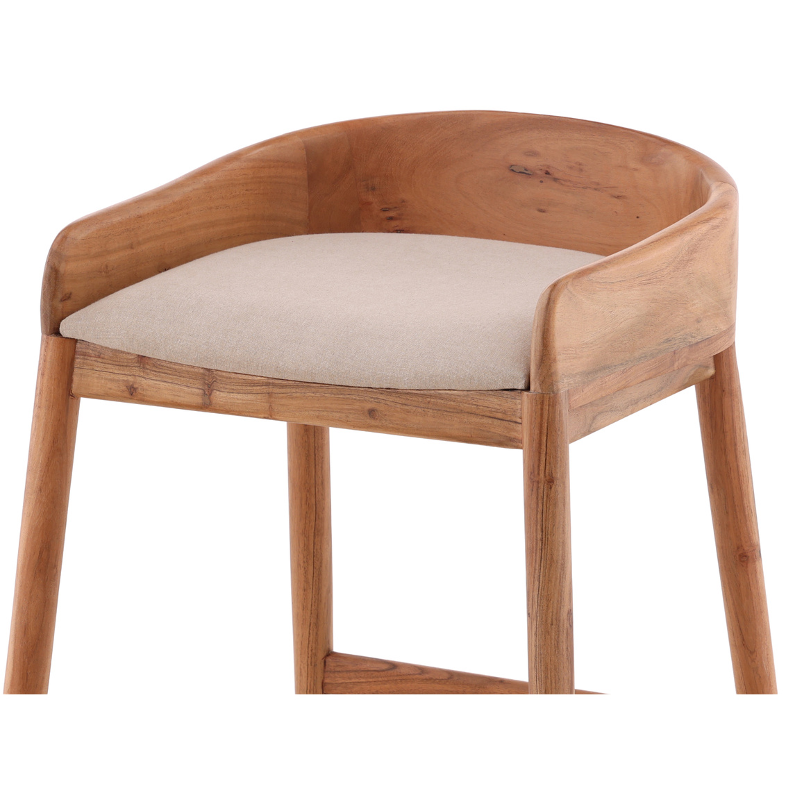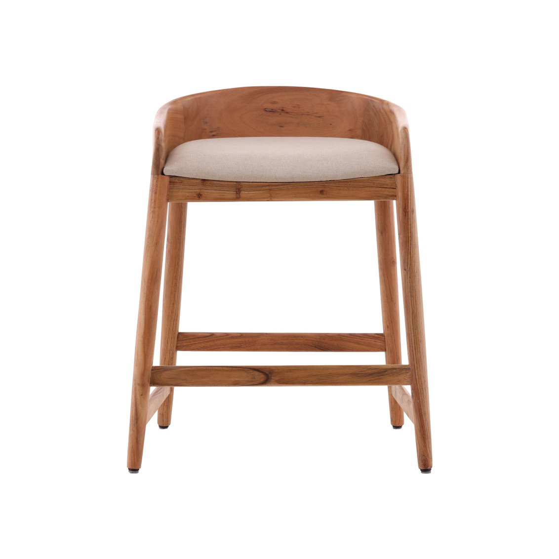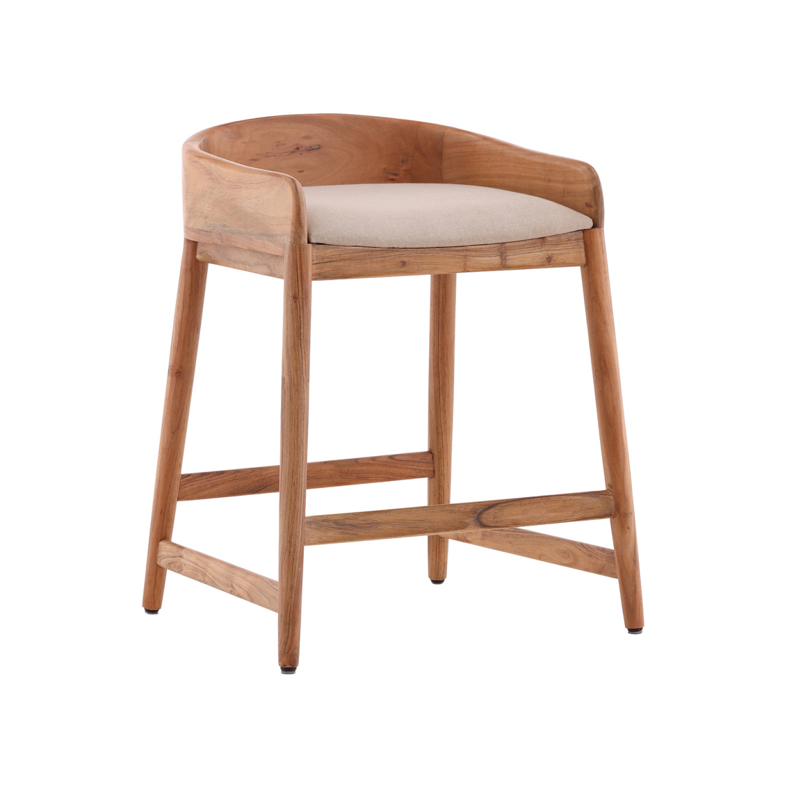 Introducing the Saddle Counter Stool, a stylish and comfortable seating option for your space. Featuring a deep honey wood brown frame and a built-in linen cushion, this stool exudes warmth and elegance. The lowered back and arms add a unique touch to the design, accentuating the natural beauty of the wood and providing a welcoming feel.