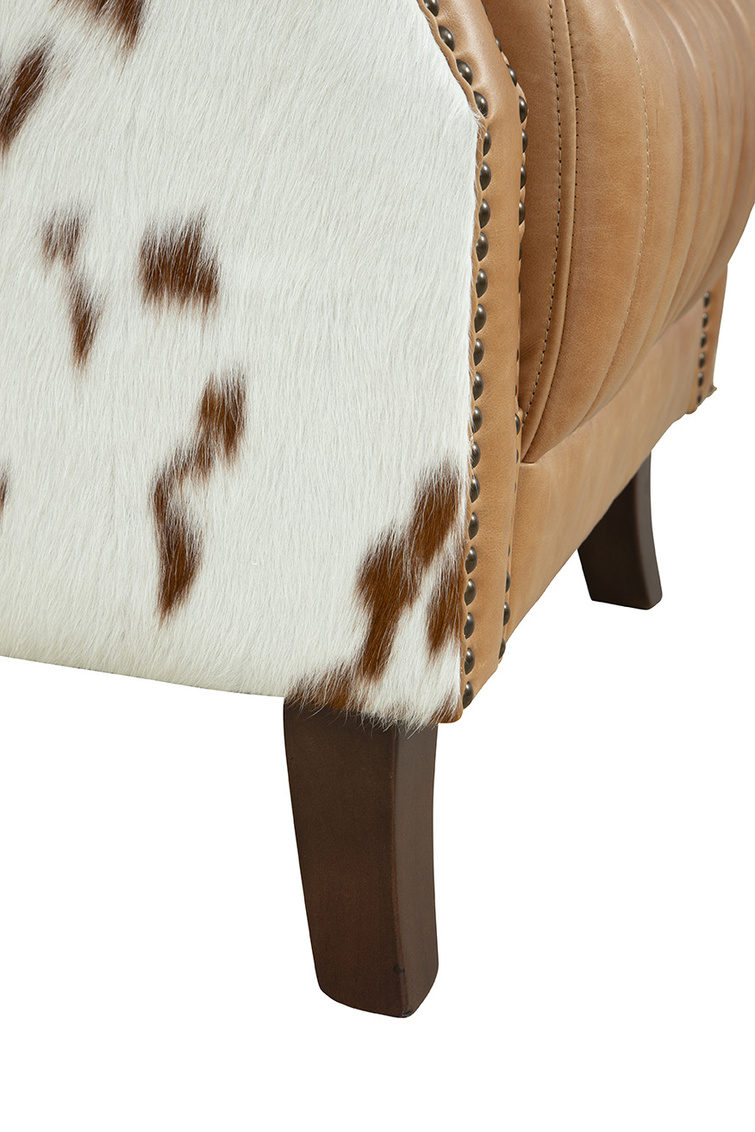 Discover the exceptional beauty of the Hyde Paris Flea Market Chair - a statement piece that exudes individuality and charm, ideal for any living room or bedroom. This one-of-a-kind chair boasts a striking contrast of design elements, featuring a honey-colored leather front paired with a luxurious hair-on-hide back. The hand-applied antique brass nails on the arms of the chair add a touch of sophistication and uniqueness to this captivating piece. Crafted to stand the test of time, the chair is built on a solid wood base, ensuring durability and longevity. The farmhouse aesthetic is further enhanced by the dark curved legs, adding a touch of elegance and character to the overall design.