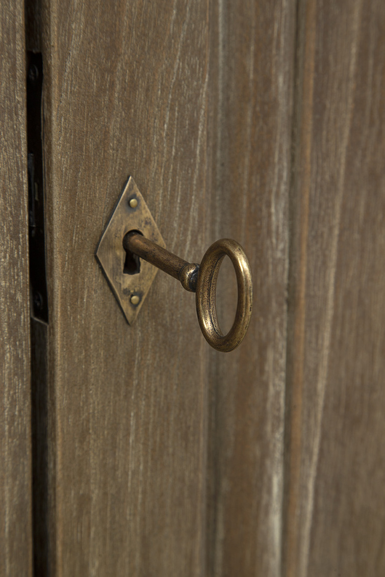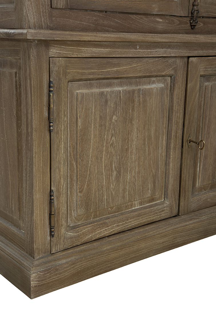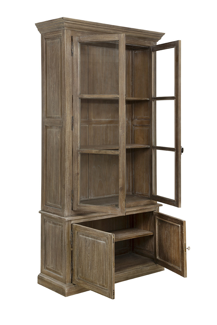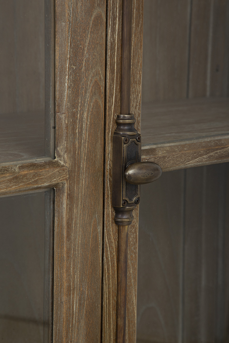 The Baker's Cabinet is a tall and sturdy mindi wood piece in a versatile neutral brown finish, perfect for blending into various decor styles. Its top features glass panel doors, ideal for displaying your favorite treasures, while the bottom boasts turn-key cabinet doors for discreet storage. Complete with vintage-inspired hardware, this cabinet adds a touch of charm to any room.