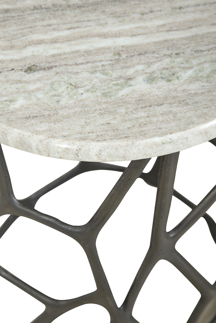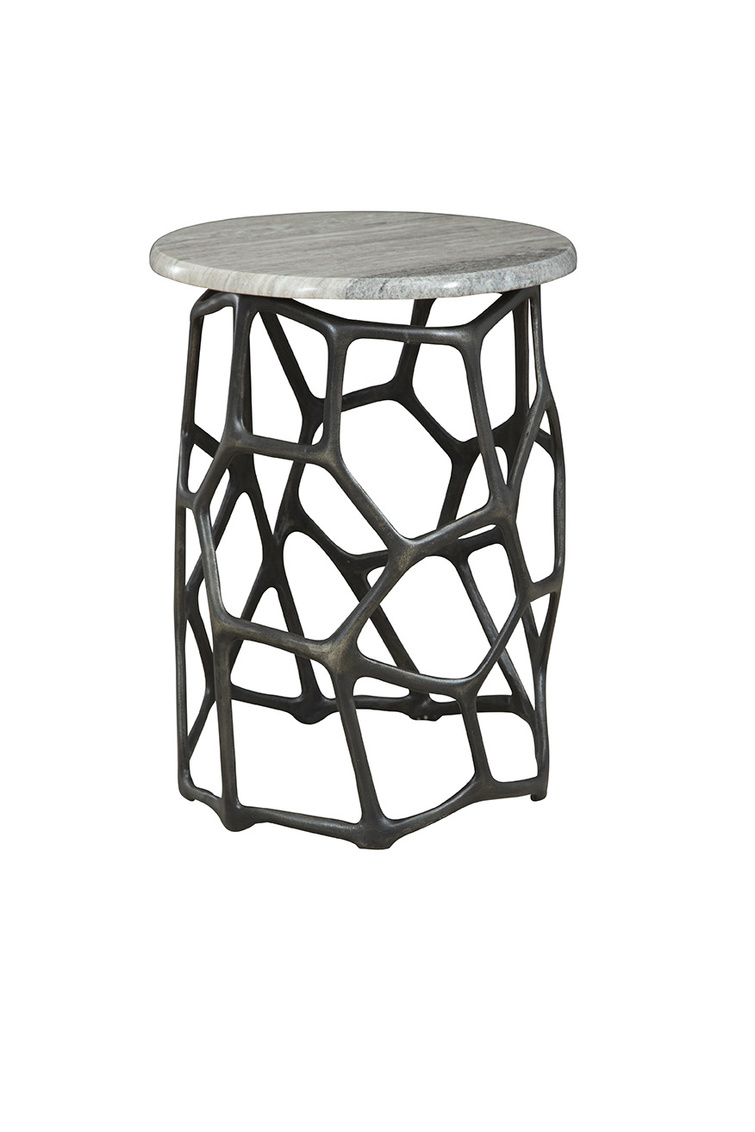 **Final Sale - All Items are sold as is, no returns unless damaged upon receipt. Meet the Short Sebastian End Table, a sibling to the Tall Sebastian End Table. This contemporary marvel effortlessly blends artistry with functionality. Featuring an asymmetrical cast aluminum base in a deep grey finish, the table exudes a sculptural essence that enriches any space. The minimal tan grey circular marble top draws focus to the captivating base, making it a standout in modern settings desiring an extra touch of flair.