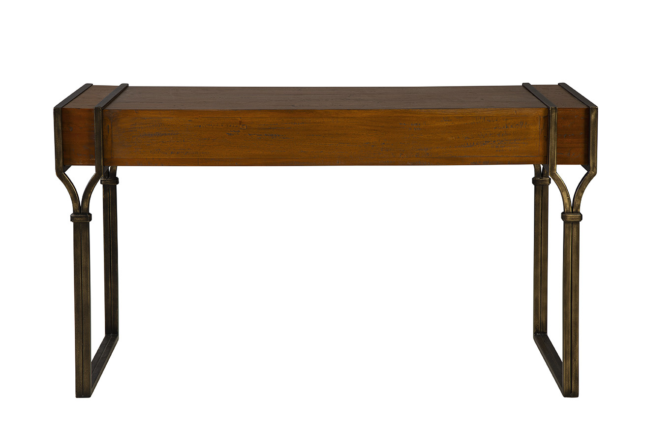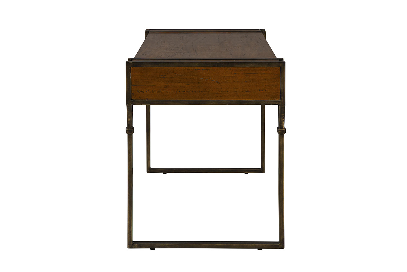 The Dark Thorpe Desk seamlessly blends industrial charm with a touch of Western flair. Its dark, warm brown wood top contrasts beautifully with brushed antique metal legs that wrap fully around the edges and complement the metal hand pulls. With a masculine yet refined design, this desk evokes the image of a vintage typewriter paired with a glass of whiskey, enhancing its rugged sophistication. Featuring two drawers for storage, it’s the perfect writing desk for those who appreciate a blend of timeless charm and practicality.