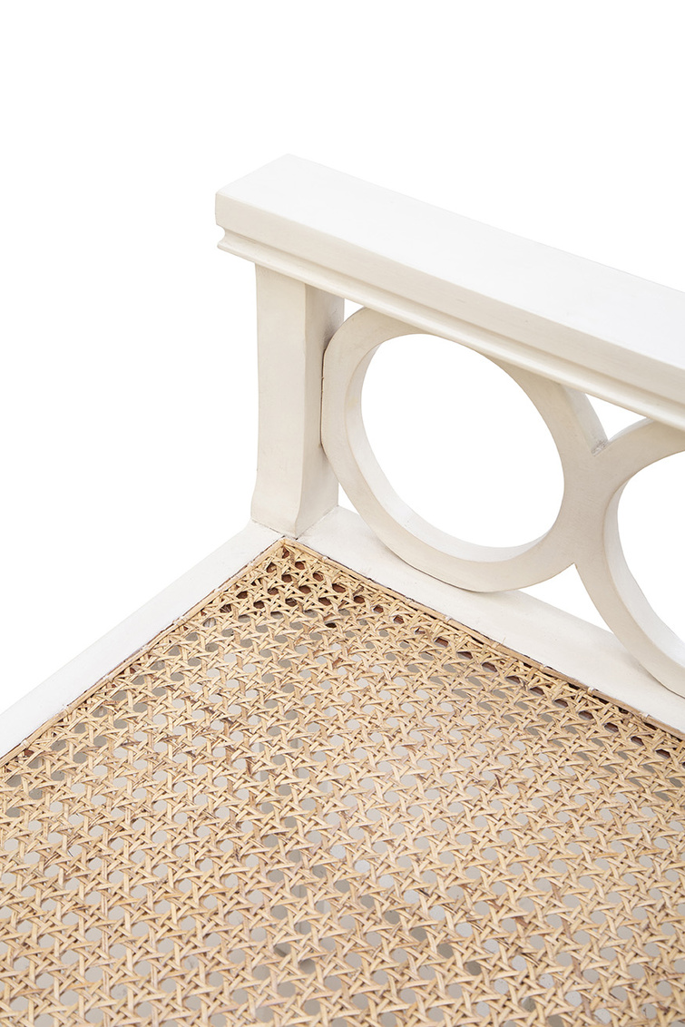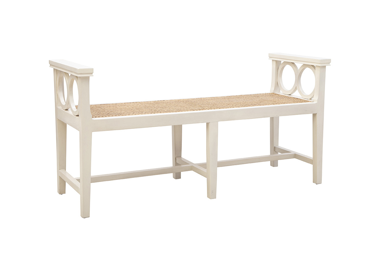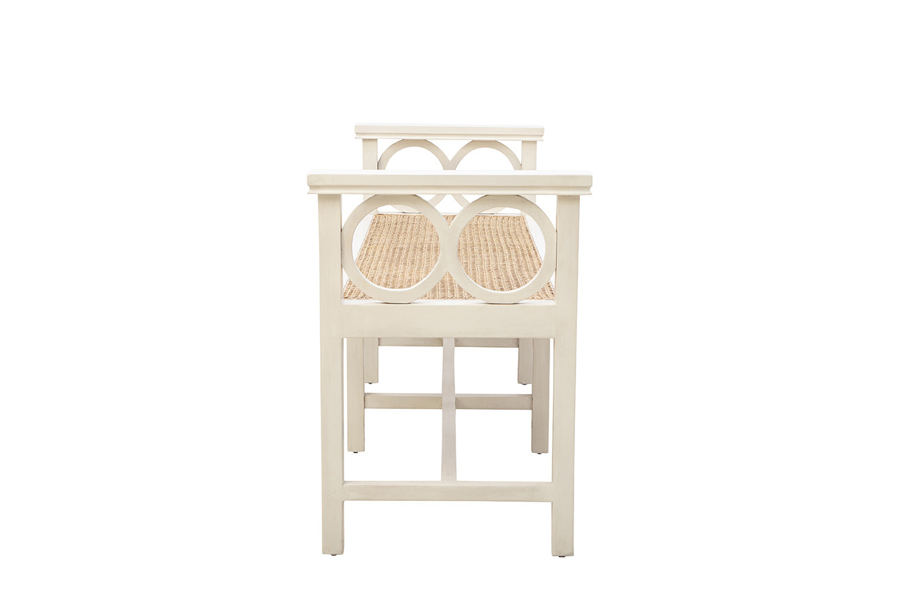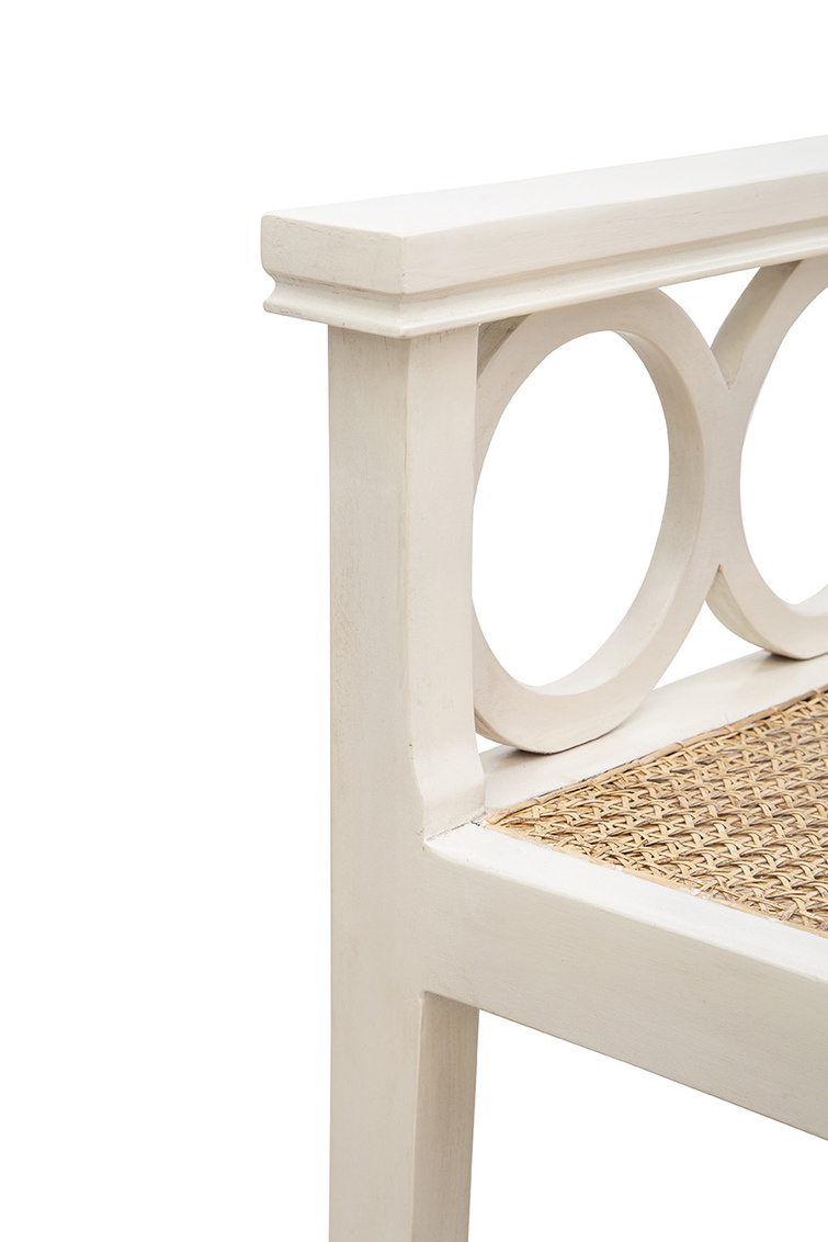 The Cream Circles Bench blends modern design with old-world charm. Its solid wood frame, finished in a creamy white, contrasts beautifully with the cane seating, offering both style and texture. Perfect for an entryway, the foot of a bed, or additional seating in a dining room or living space, this bench adds timeless elegance to any room while remaining versatile and functional.
