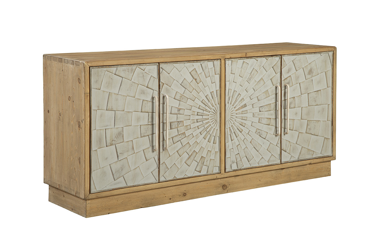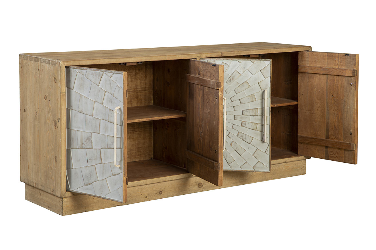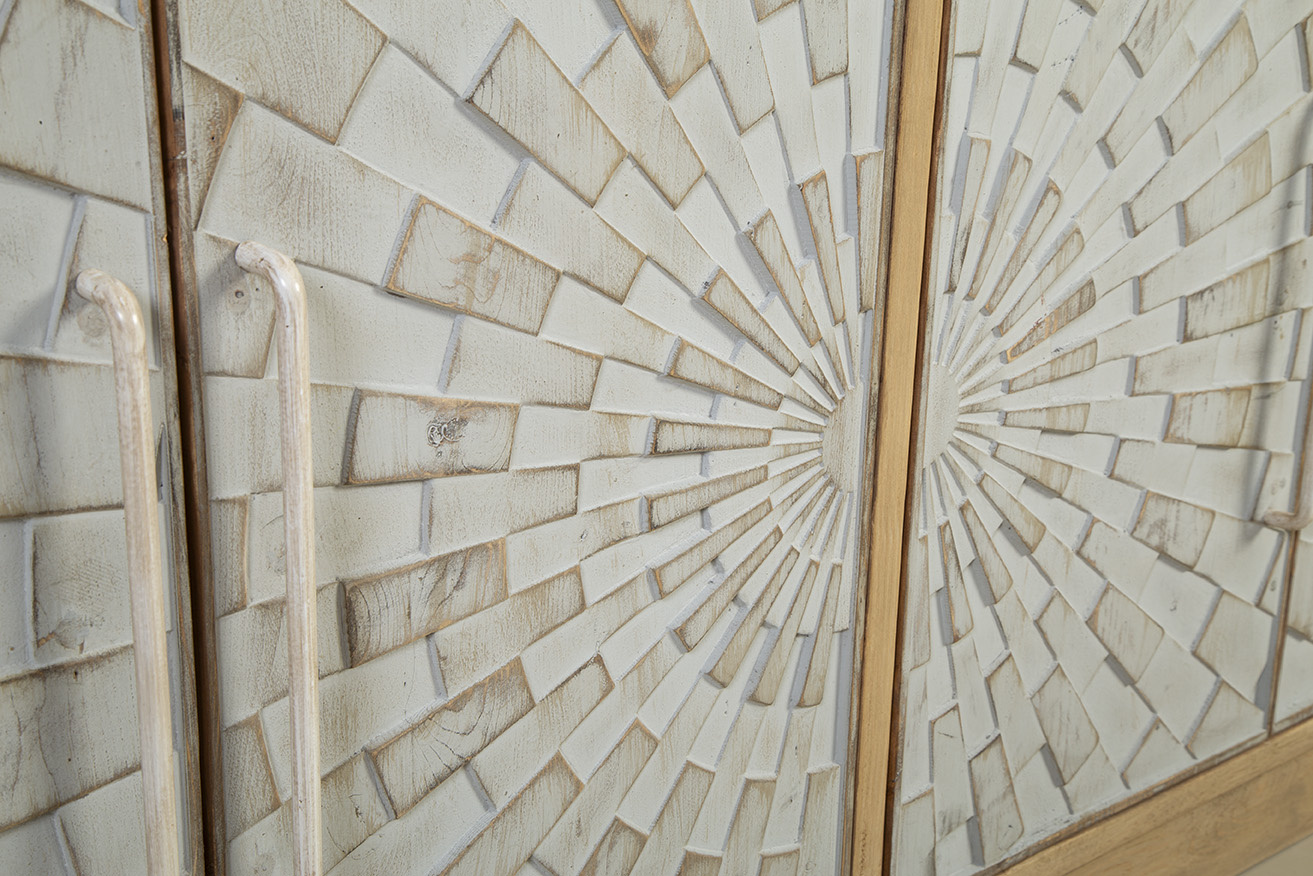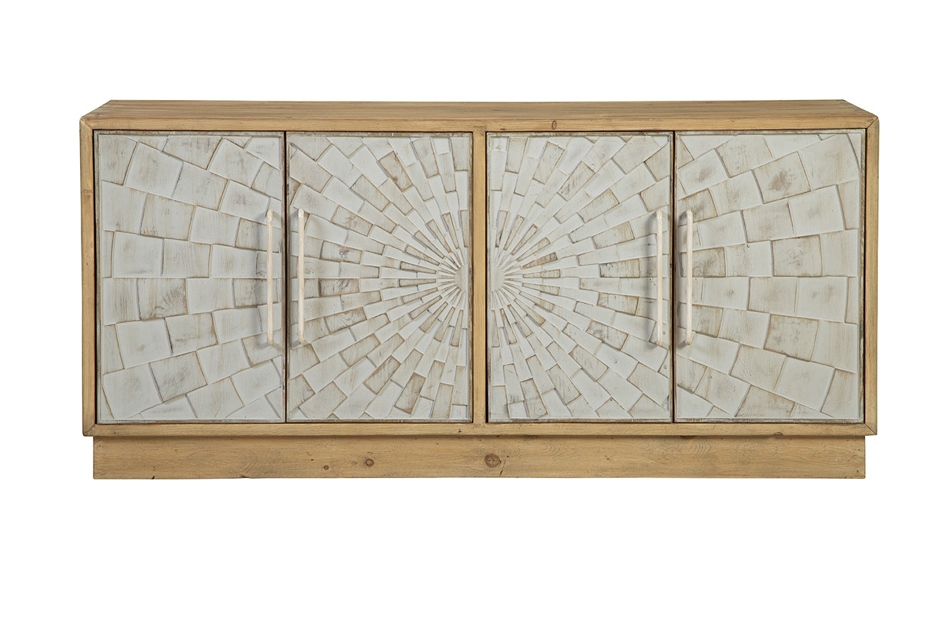 **Final Sale - All Items are sold as is, no returns unless damaged upon receipt. The Brighton Sideboard is a stunning blend of modern design and natural elegance. Crafted from solid wood in a light natural finish, this sideboard features two sets of cabinet doors, showcasing a striking 3-dimensional geometric design. The intricate carved pattern resembles a checkerboard sun ray effect, adding depth and visual interest to the piece. Finished in a soft white wash, the doors are complemented by creamy white metal hand pulls that seamlessly match the front, enhancing the minimalist yet bold look. The front design truly steals the spotlight, making this sideboard a standout addition to any room.
