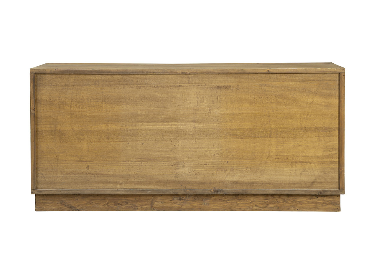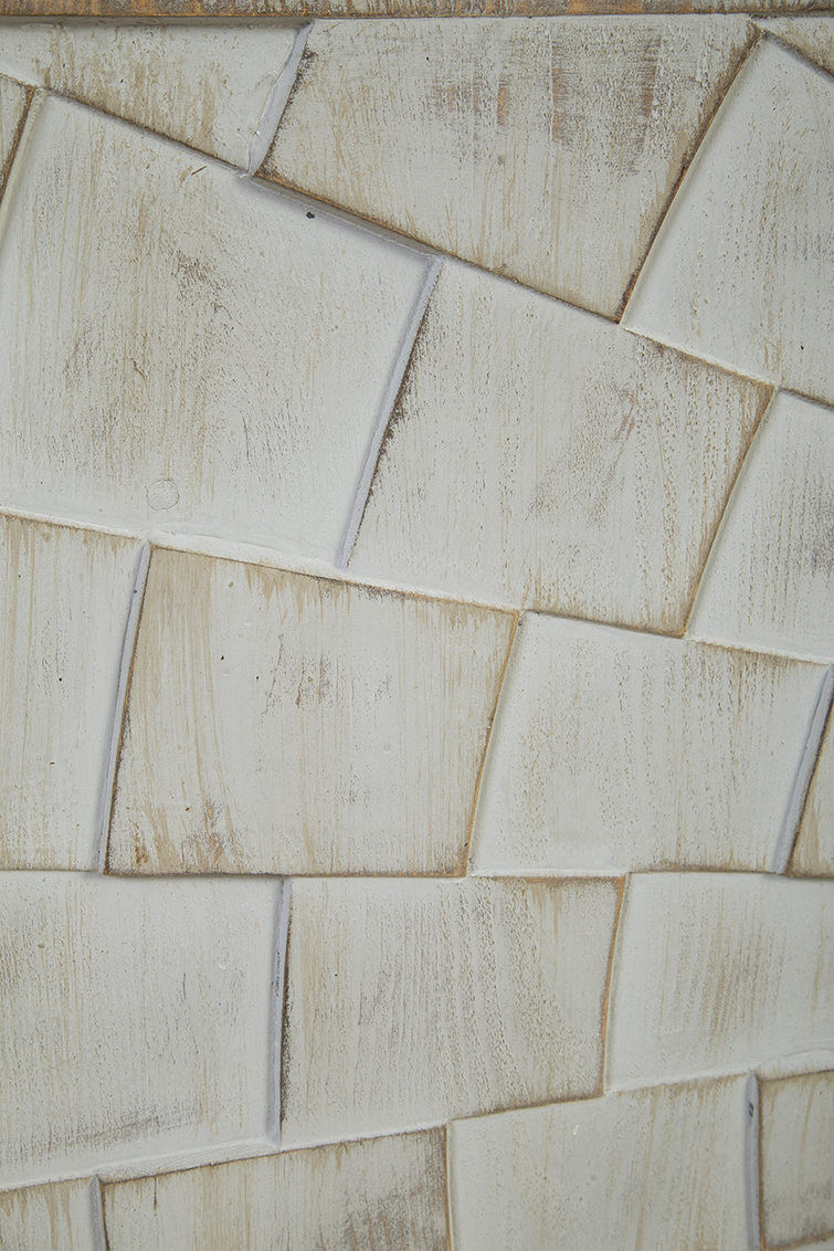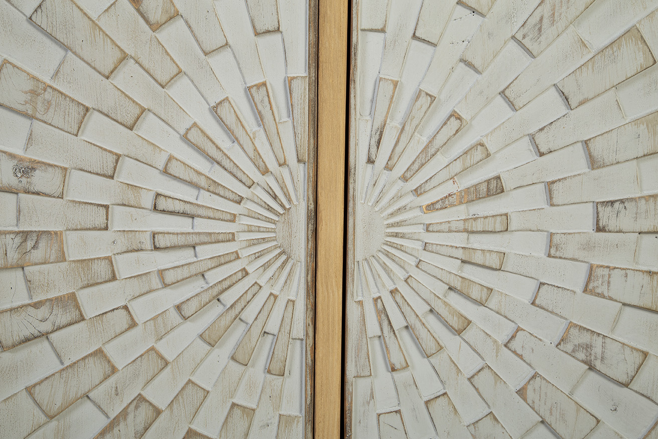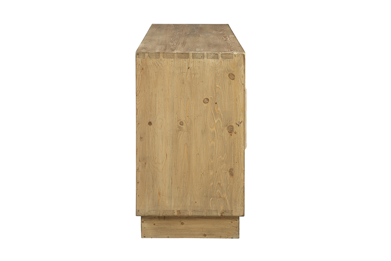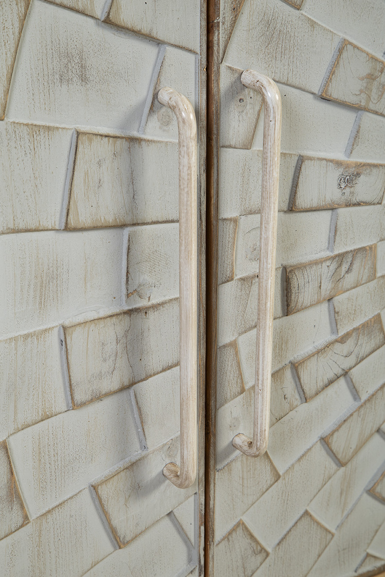 **Final Sale - All Items are sold as is, no returns unless damaged upon receipt. The Brighton Sideboard is a stunning blend of modern design and natural elegance. Crafted from solid wood in a light natural finish, this sideboard features two sets of cabinet doors, showcasing a striking 3-dimensional geometric design. The intricate carved pattern resembles a checkerboard sun ray effect, adding depth and visual interest to the piece. Finished in a soft white wash, the doors are complemented by creamy white metal hand pulls that seamlessly match the front, enhancing the minimalist yet bold look. The front design truly steals the spotlight, making this sideboard a standout addition to any room.
