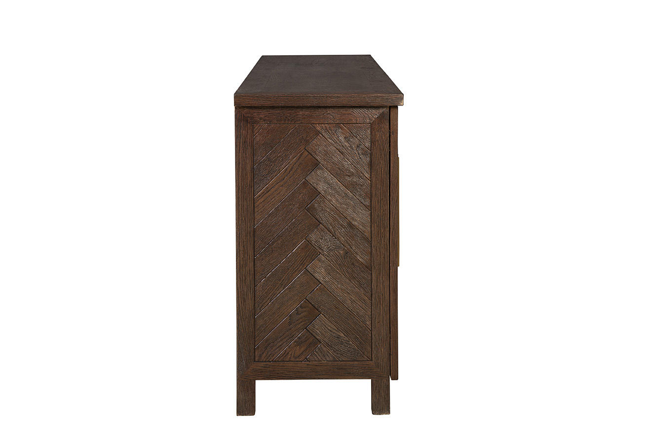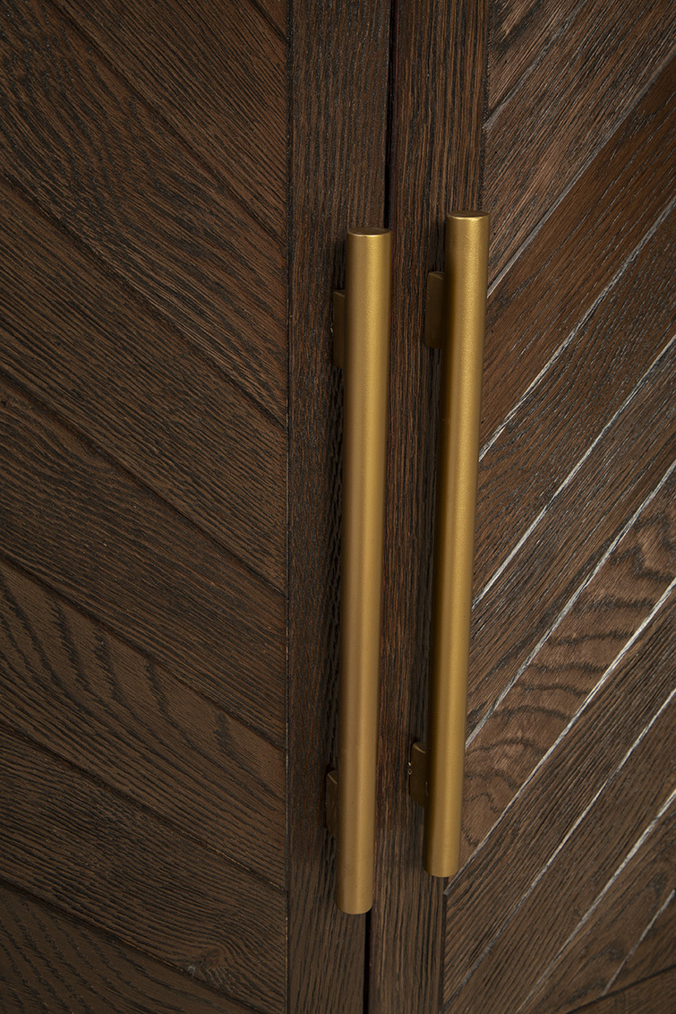 The Chocolate Kelly Sideboard is a perfect blend of retro charm and modern design. Crafted from rich, dark brown Toonwood, this two-cabinet sideboard offers ample storage space while making a bold style statement. The arrow wood paneling on the cabinet fronts adds a subtle yet striking design detail, while sleek modern gold hand pulls enhance its contemporary appeal. With its modern build and nostalgic dark wood finish reminiscent of the 80s, this sideboard is a unique addition to any interior.
