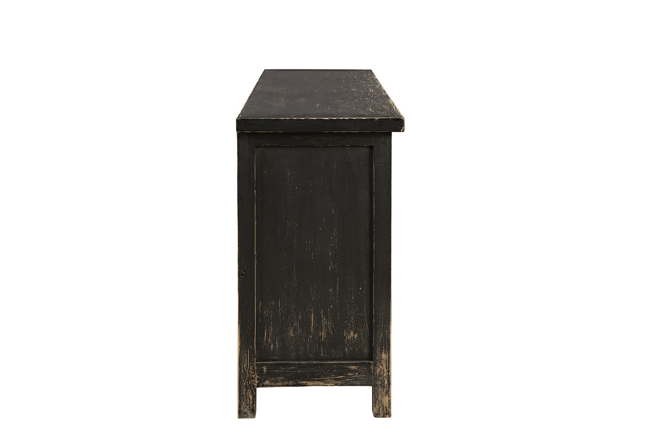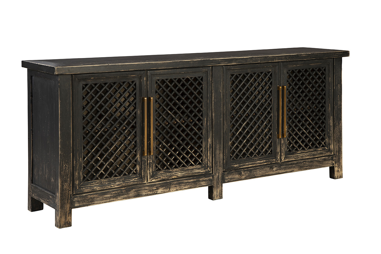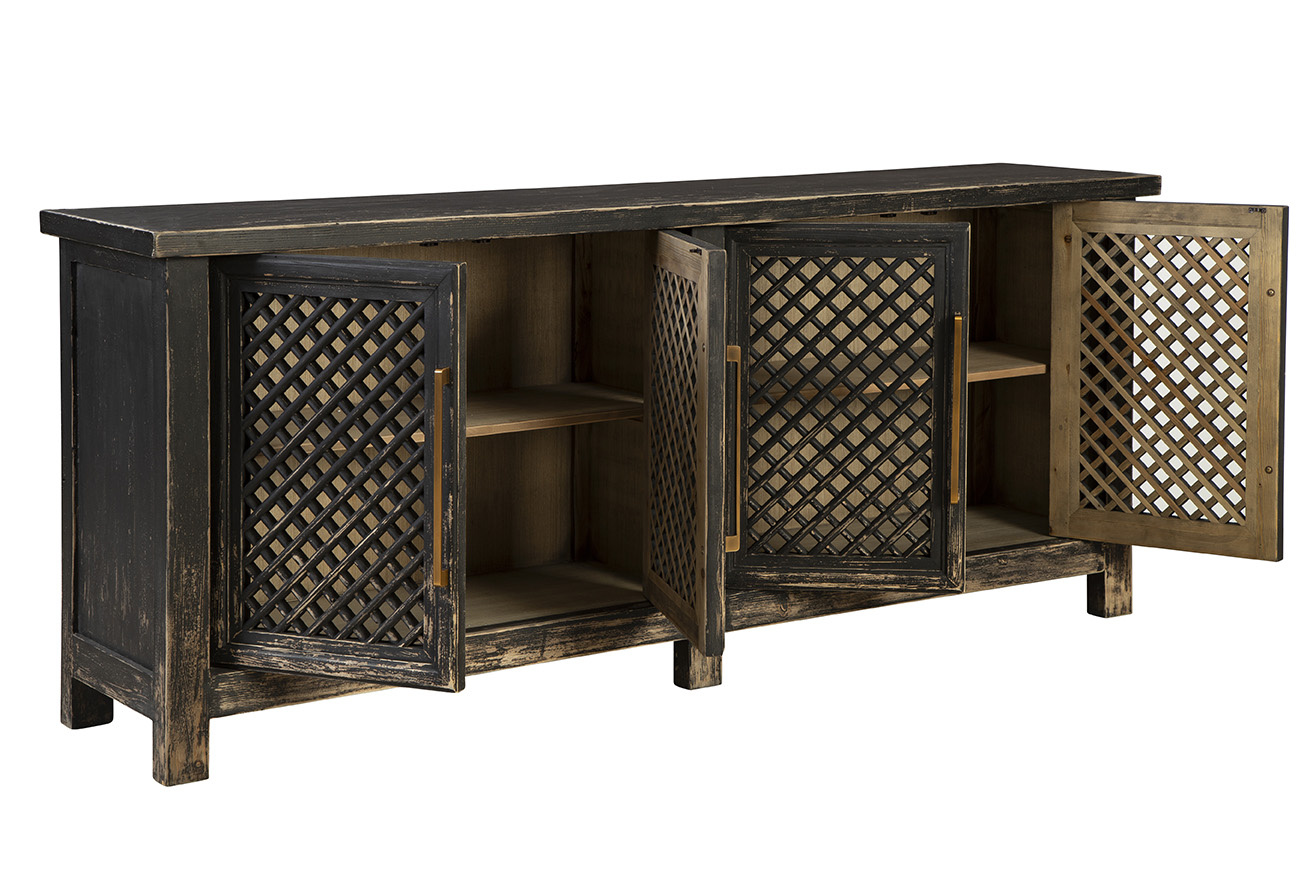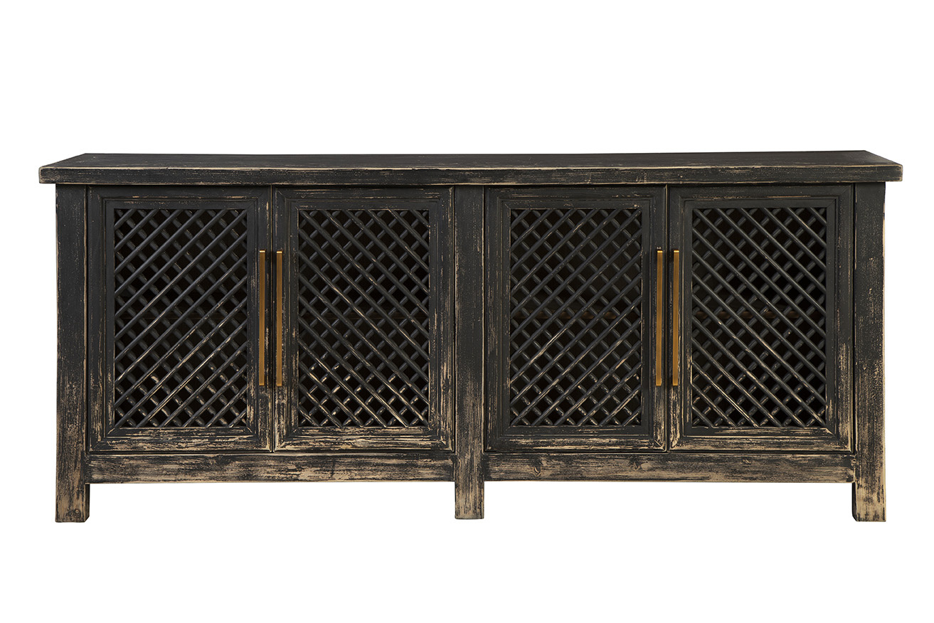 The Sabre Sideboard combines timeless craftsmanship with a contemporary touch. Handcrafted from reclaimed pine, its distressed black finish highlights the natural grain and rustic character of the wood. Spacious and functional, the Sabre Sideboard features paneled cabinet doors with open latticework, evoking a subtle British colonial influence. Modern gold hand pulls provide a refined contrast, enhancing its elegant yet weathered appeal. Perfect for dining rooms, living spaces, or entryways, it offers both storage and style.