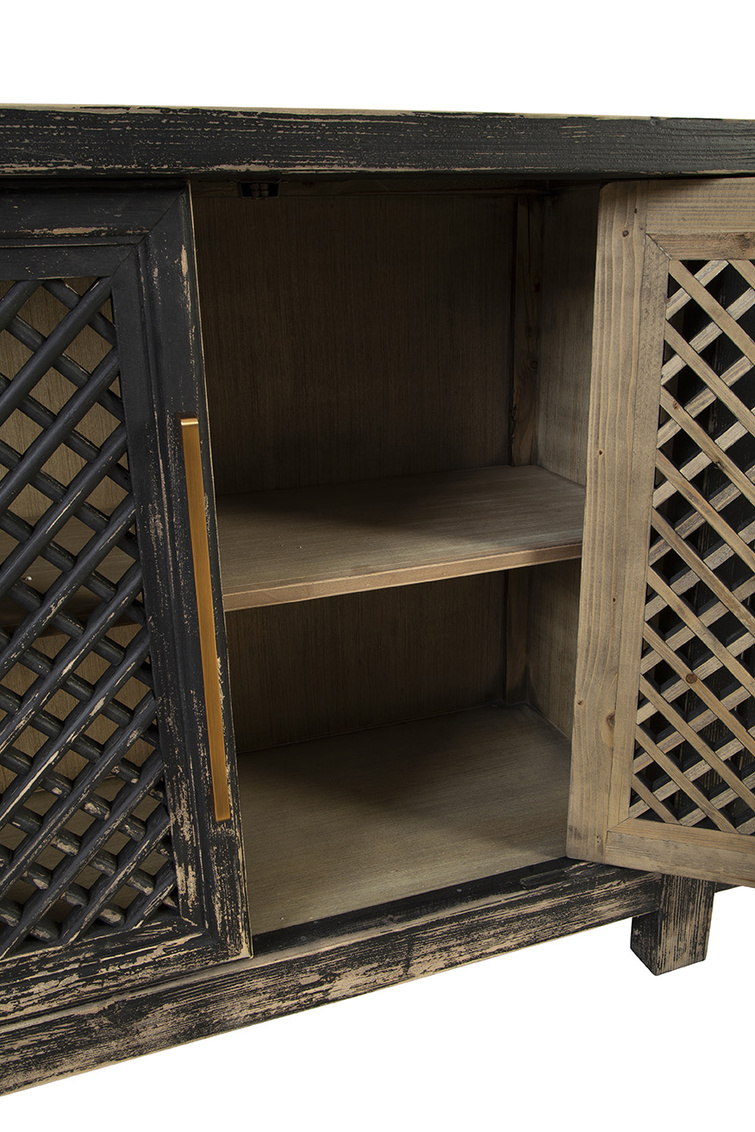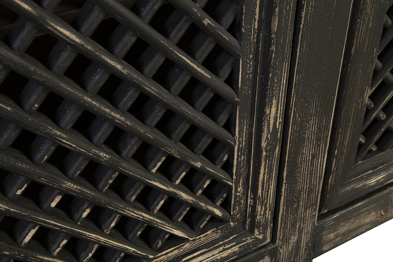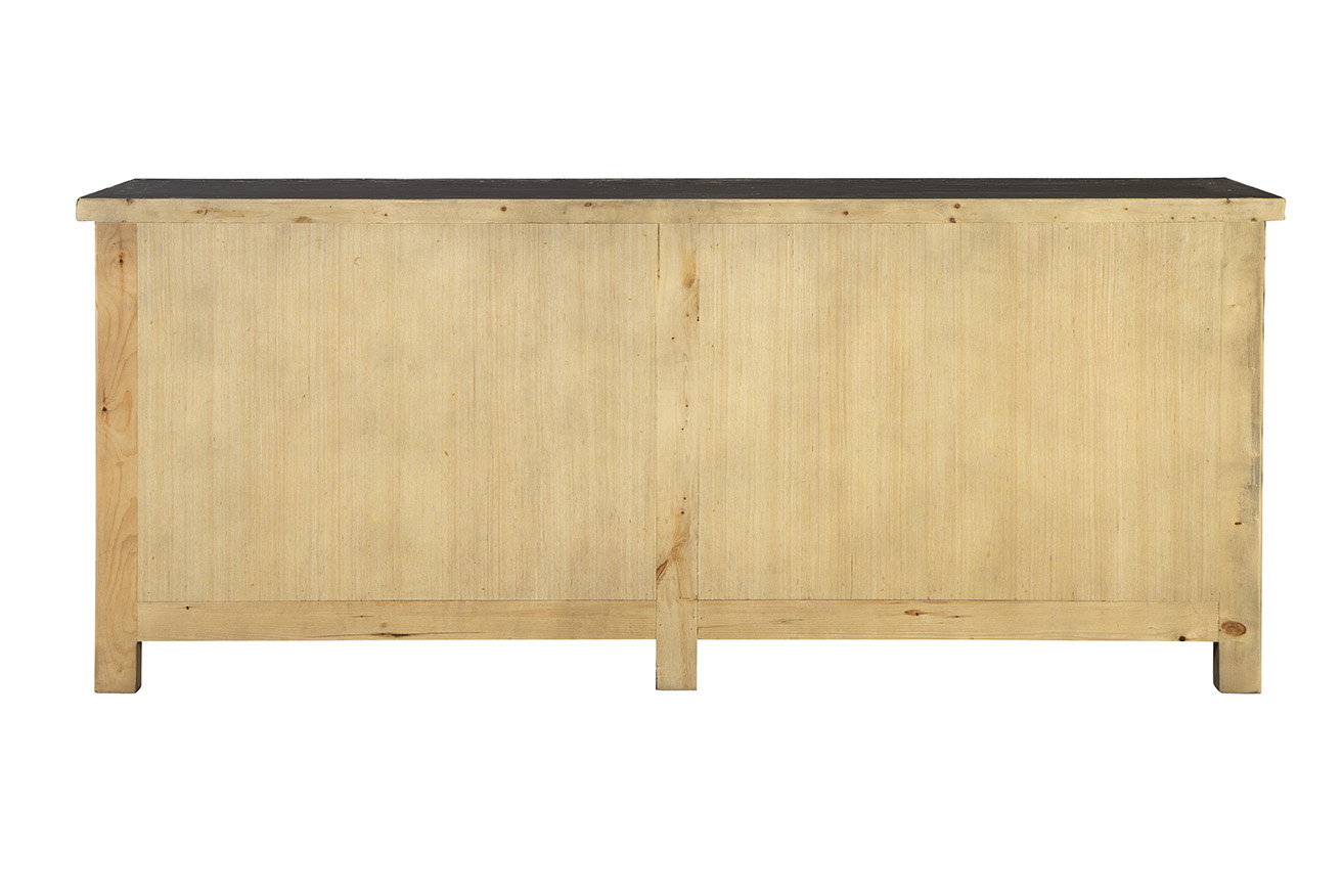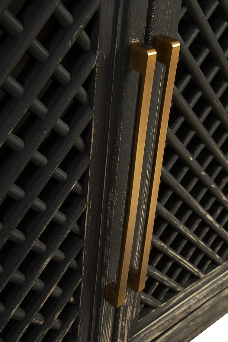 The Sabre Sideboard combines timeless craftsmanship with a contemporary touch. Handcrafted from reclaimed pine, its distressed black finish highlights the natural grain and rustic character of the wood. Spacious and functional, the Sabre Sideboard features paneled cabinet doors with open latticework, evoking a subtle British colonial influence. Modern gold hand pulls provide a refined contrast, enhancing its elegant yet weathered appeal. Perfect for dining rooms, living spaces, or entryways, it offers both storage and style.