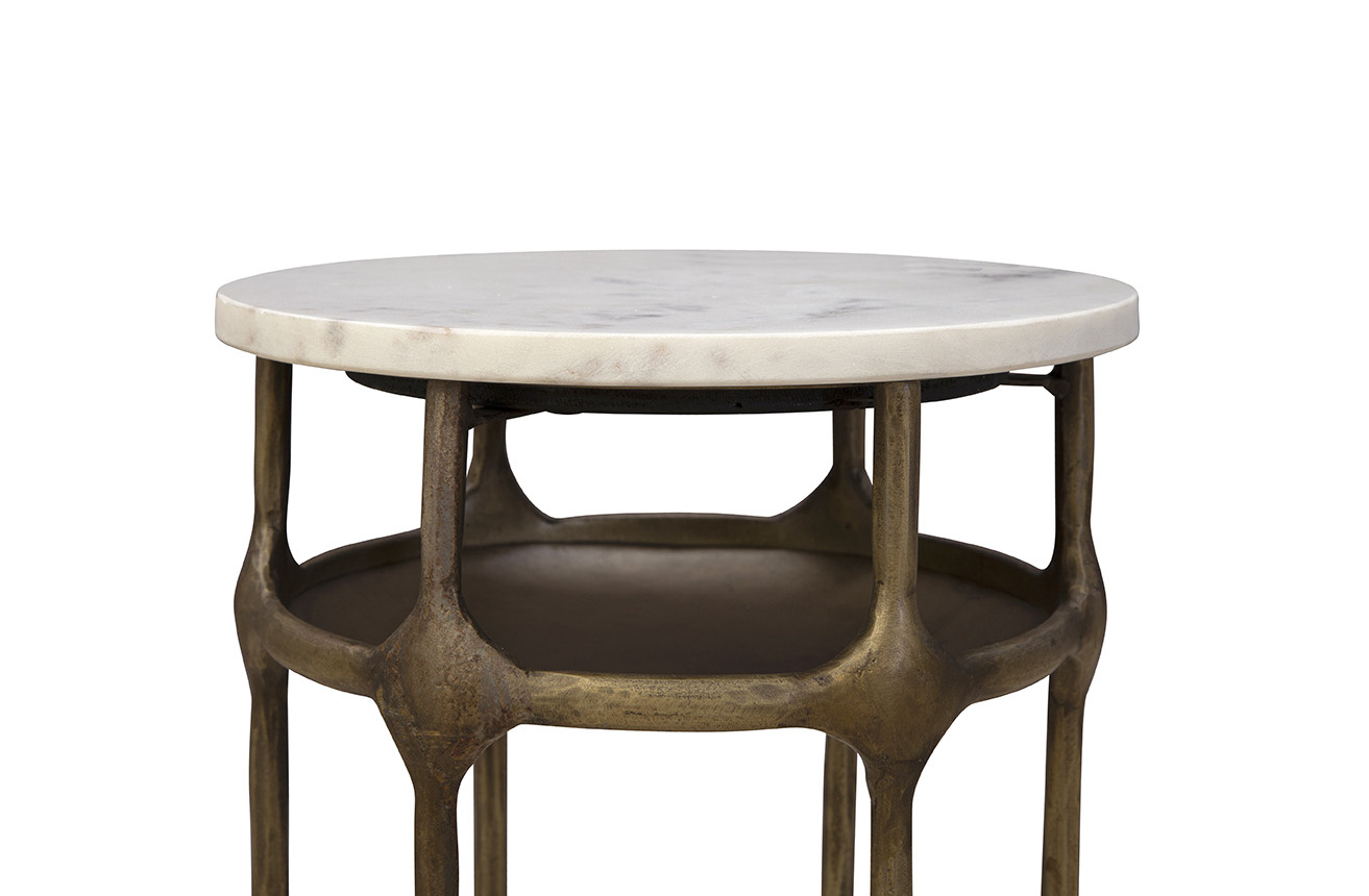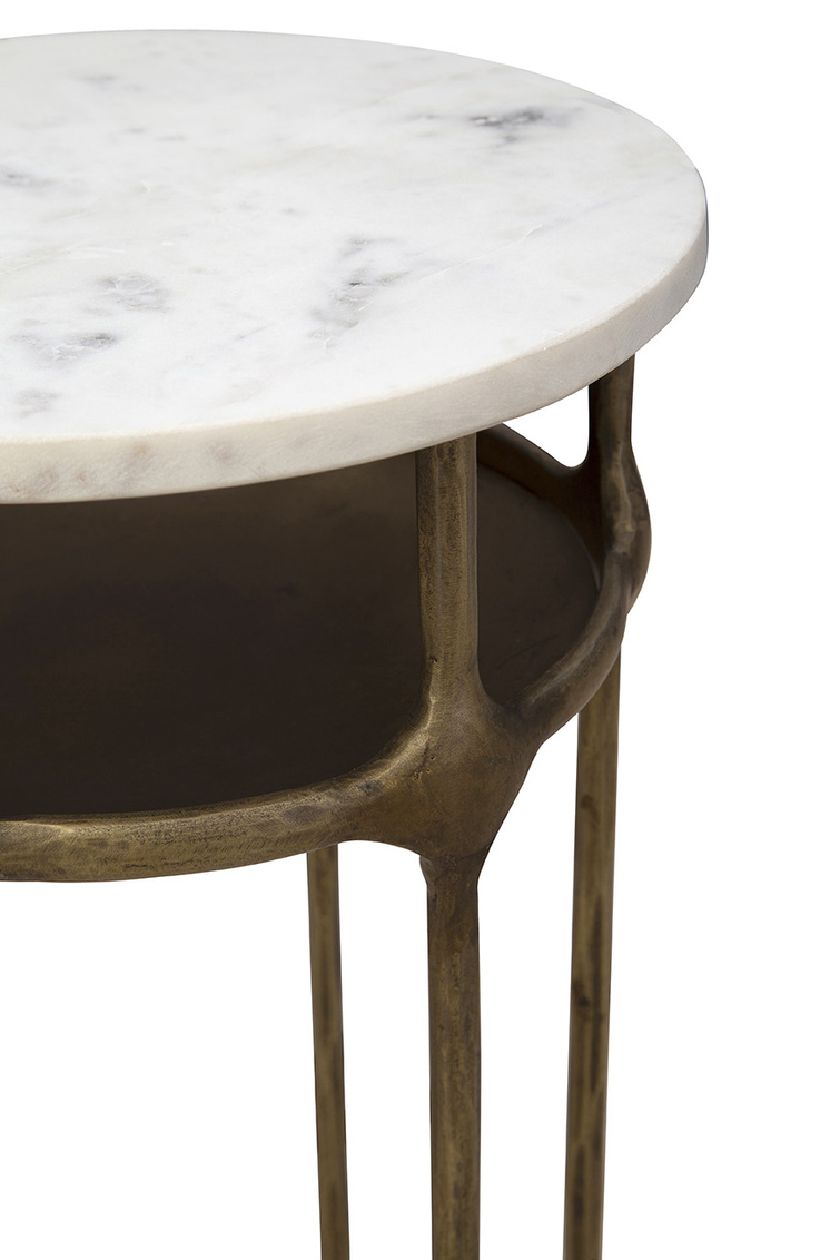 The Moira Side Table is a petite yet hefty piece of functional art. Featuring a small circular white marble top and an antique gold-colored metal base, it offers a striking contrast that enhances any contemporary living space. The metal base includes six straight-line legs and a small lower shelf, combining elegance with practicality. Perfectly sized for smaller spaces, the Moira Side Table is a sophisticated and artistic addition to your home.