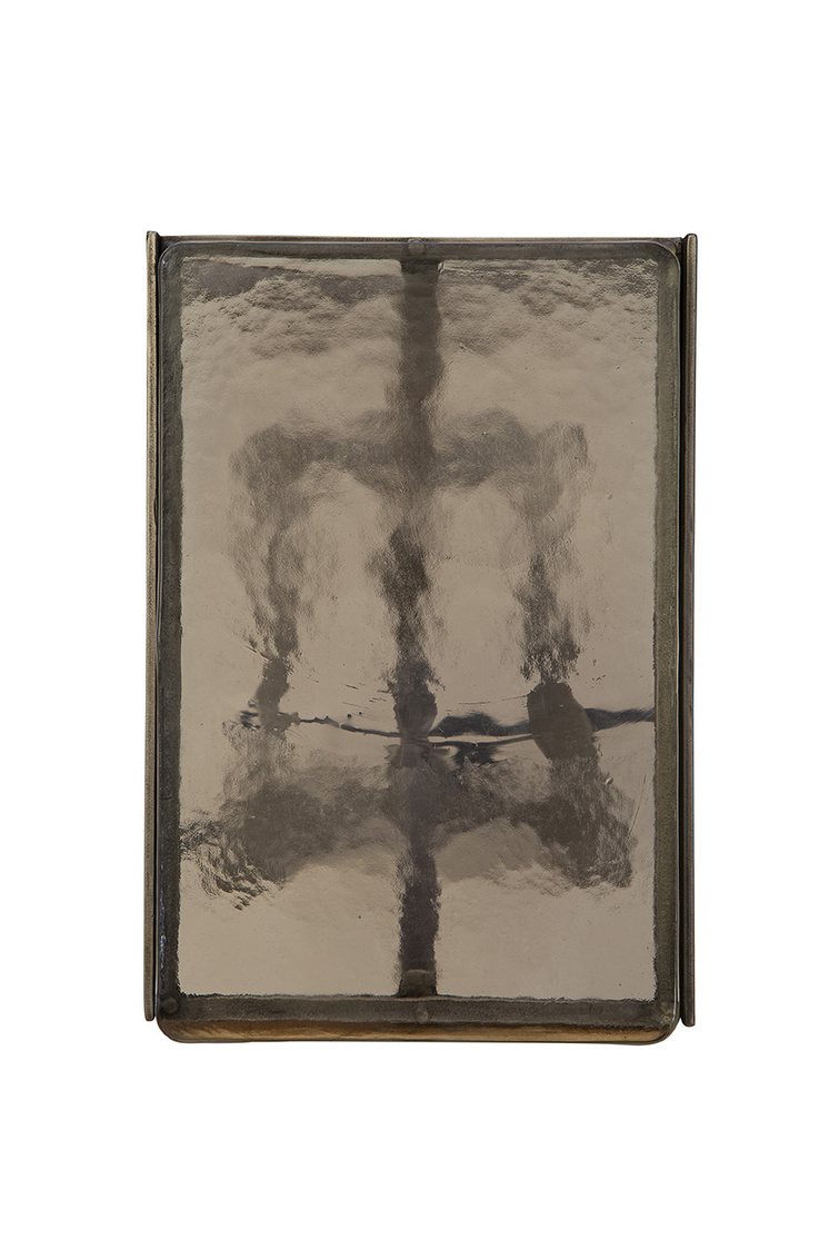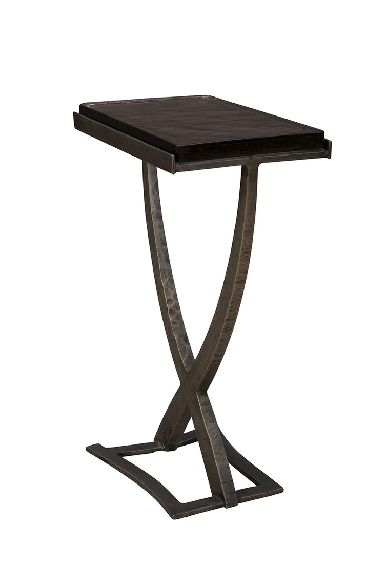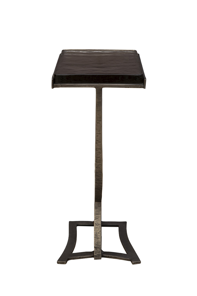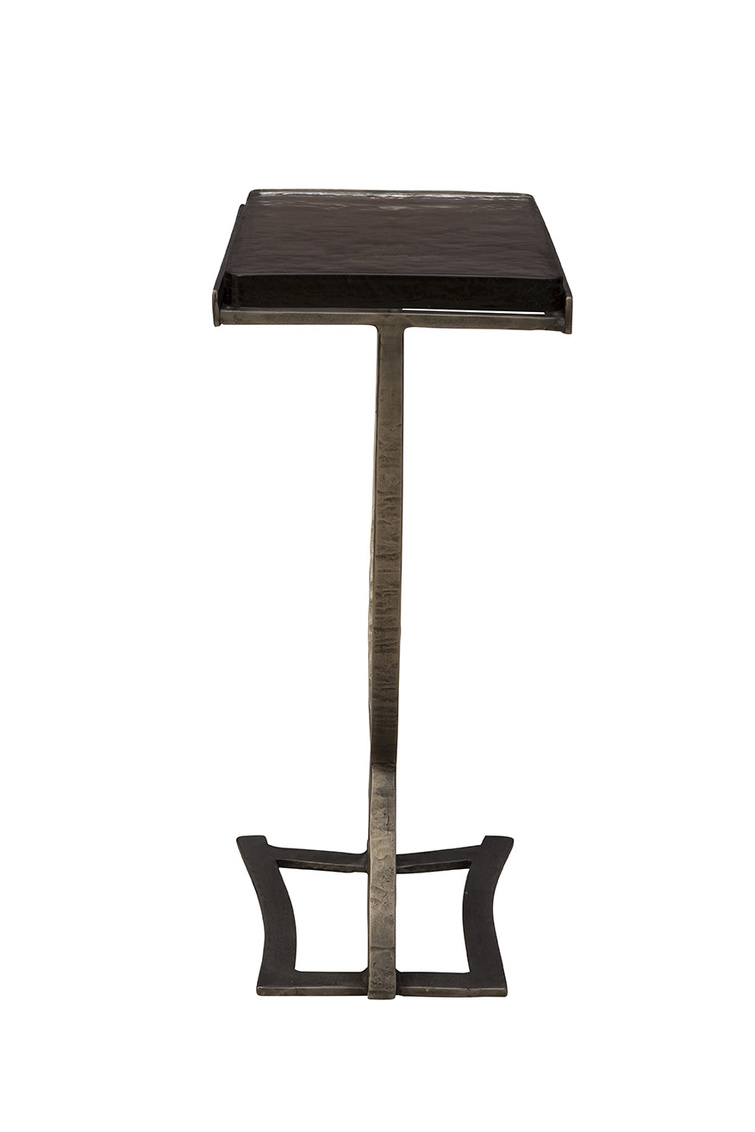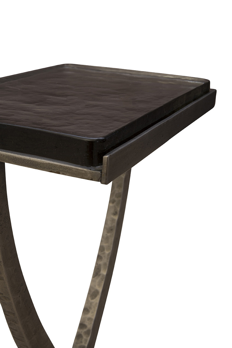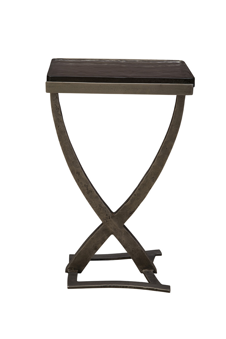 The Toulon Side Table seamlessly combines industrial charm with a touch of glamour. Its antique hammered brass X-base, reminiscent of elegantly crossed blades of grass, sits atop a sturdier rectangular foundation for both style and stability. Topped with a thick, dark-tinted tempered glass surface featuring an organic texture, this table exudes visual depth and sophisticated character, making it a standout piece in any space.