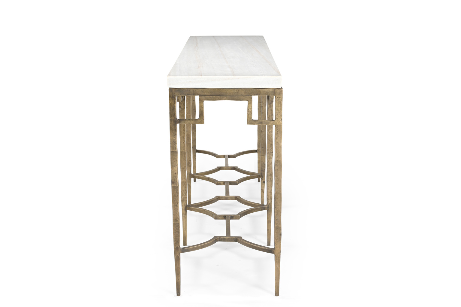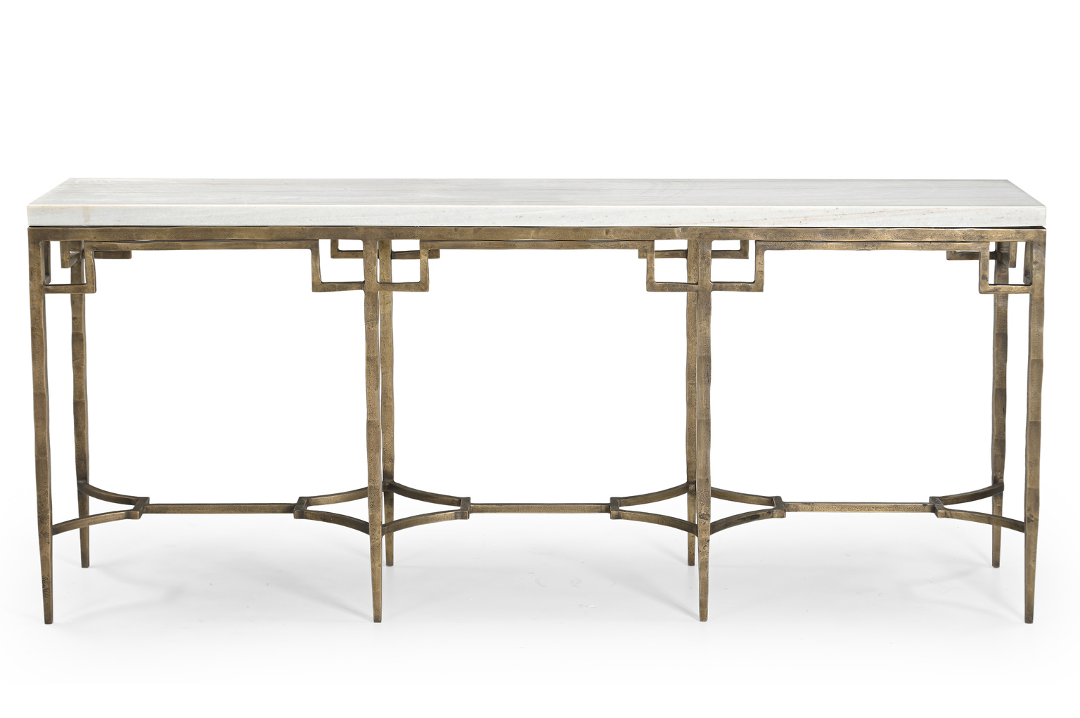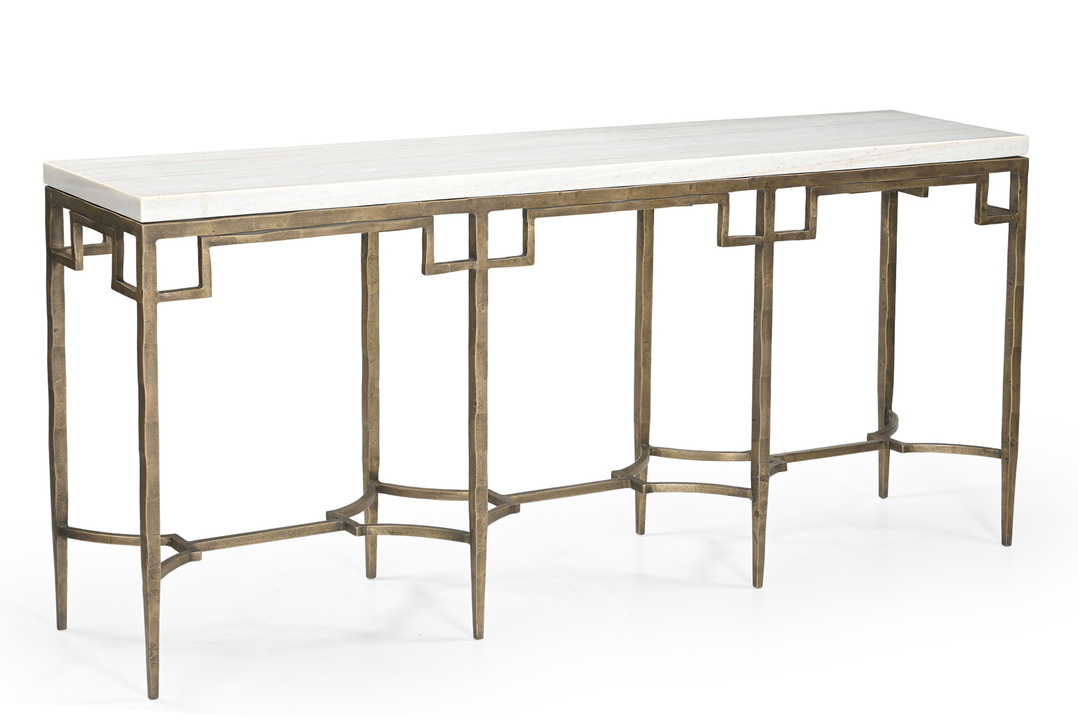 The Tours Console is an artistically crafted masterpiece that combines elegance and functionality. Featuring a sleek rectangular white marble tabletop, it rests on an antique hammered brass base with eight straight-line legs. The legs are connected by intricate sculptural metalwork that not only enhances the design but also provides added stability. A perfect blend of sophistication and artistry, the Tours Console is a striking addition to any space.