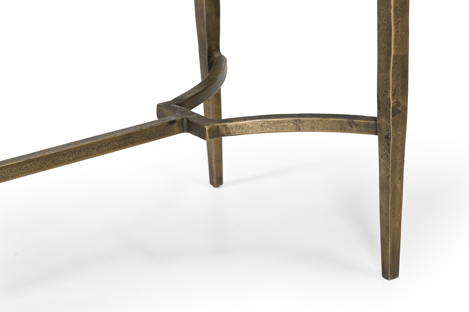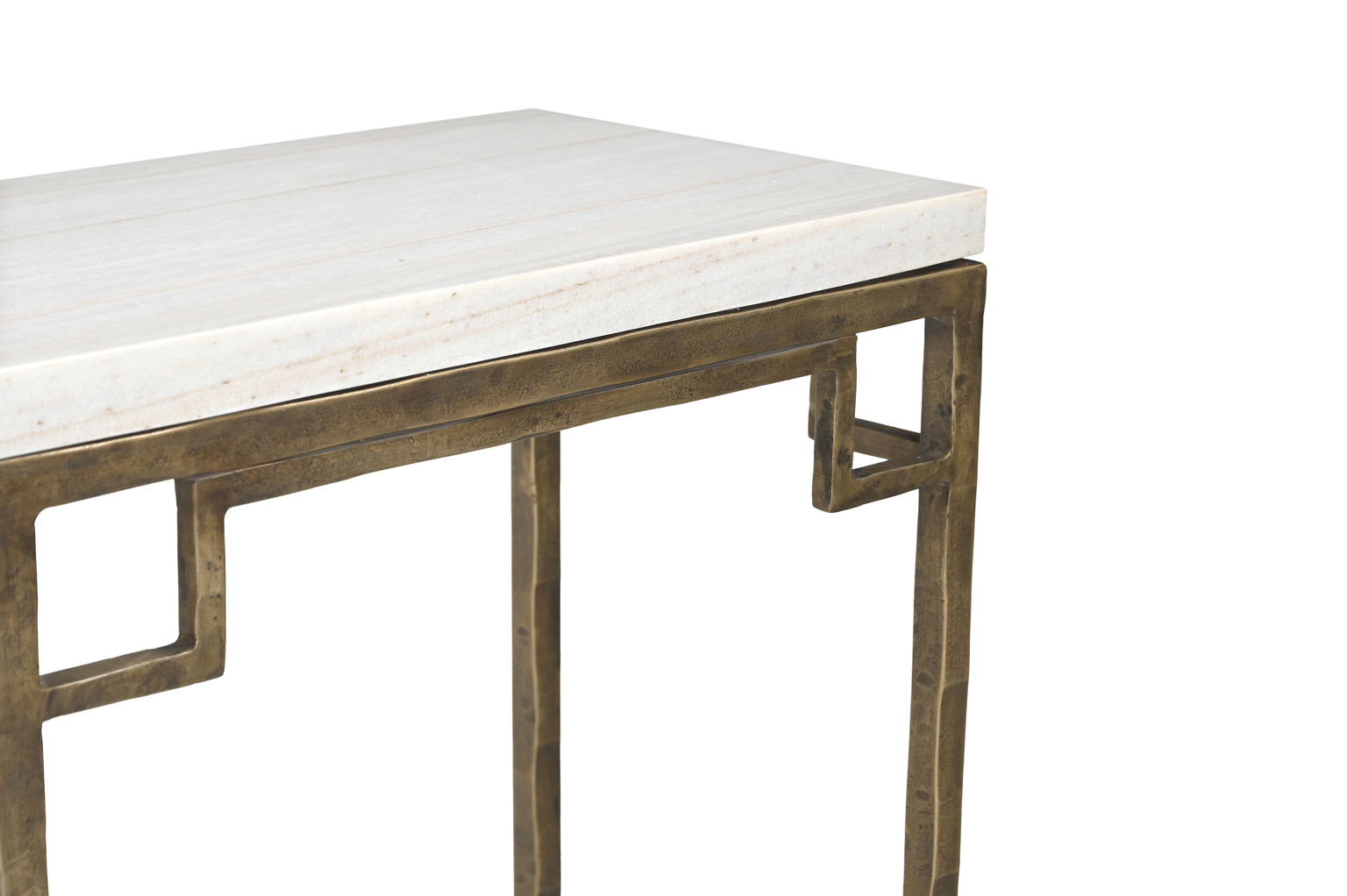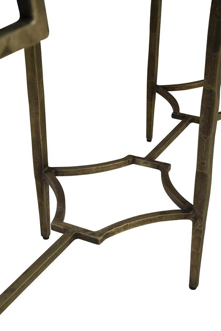 The Tours Console is an artistically crafted masterpiece that combines elegance and functionality. Featuring a sleek rectangular white marble tabletop, it rests on an antique hammered brass base with eight straight-line legs. The legs are connected by intricate sculptural metalwork that not only enhances the design but also provides added stability. A perfect blend of sophistication and artistry, the Tours Console is a striking addition to any space.