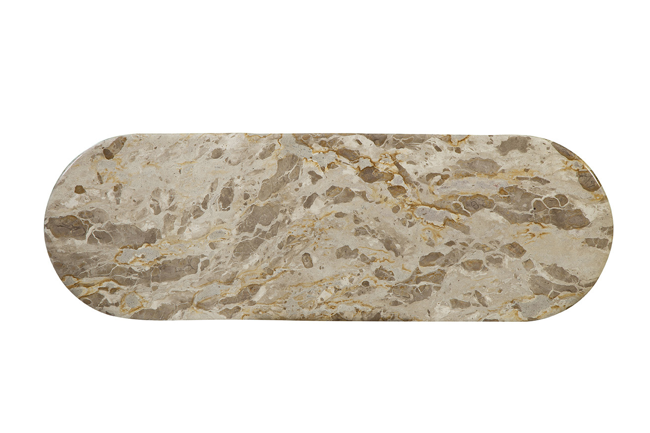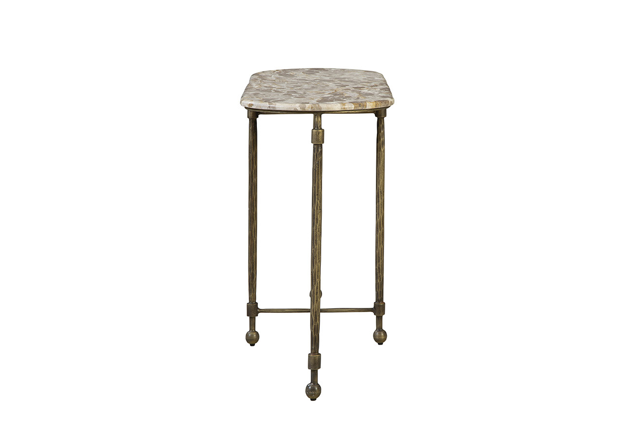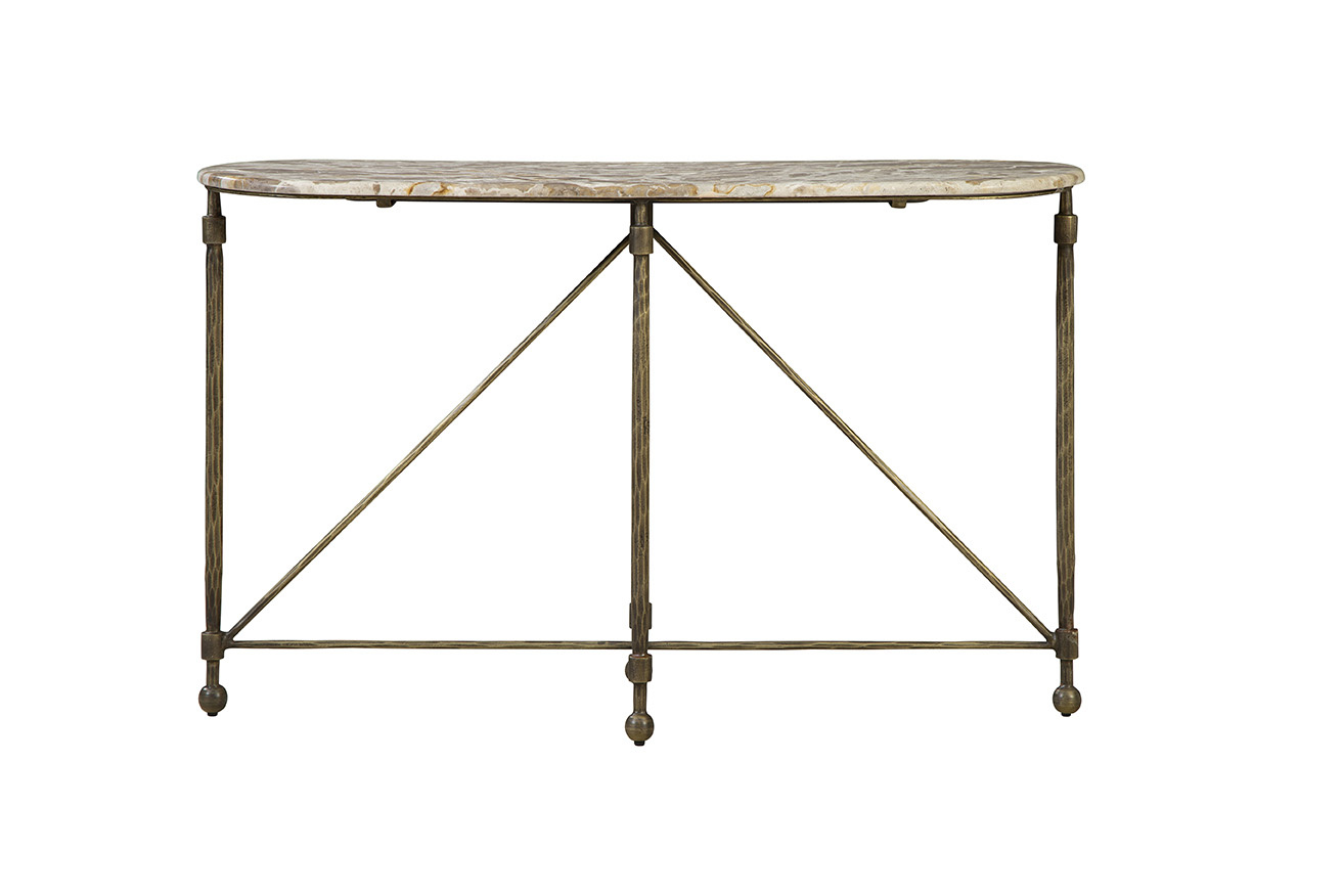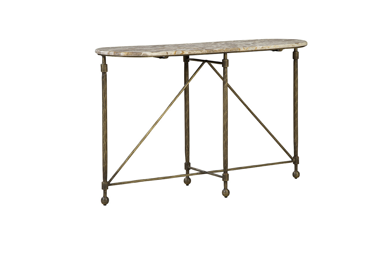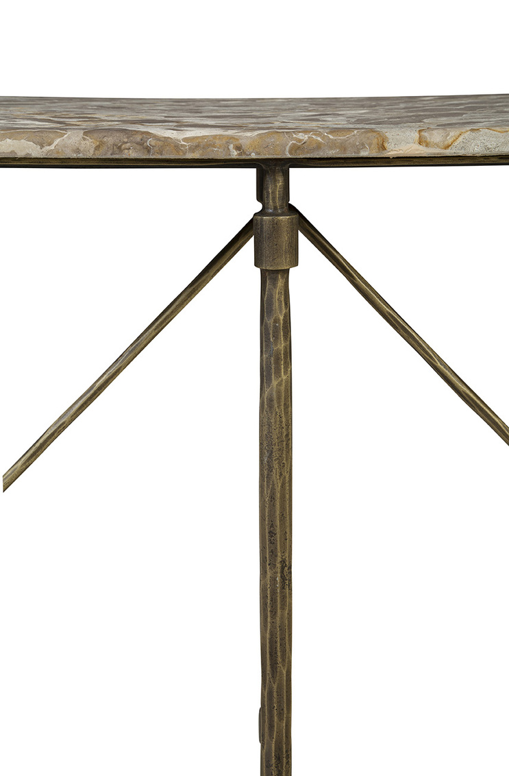 The Colmar Console combines the same modern elegance and artistic appeal as the Colmar Cocktail Table, now in a taller, elongated design. Featuring a sleek, lengthy oval marble tabletop, it rests on four hammered antique brass legs. Triangular antique brass support beams add stability and a subtle geometric touch, making this console a sophisticated and eye-catching addition to any space.