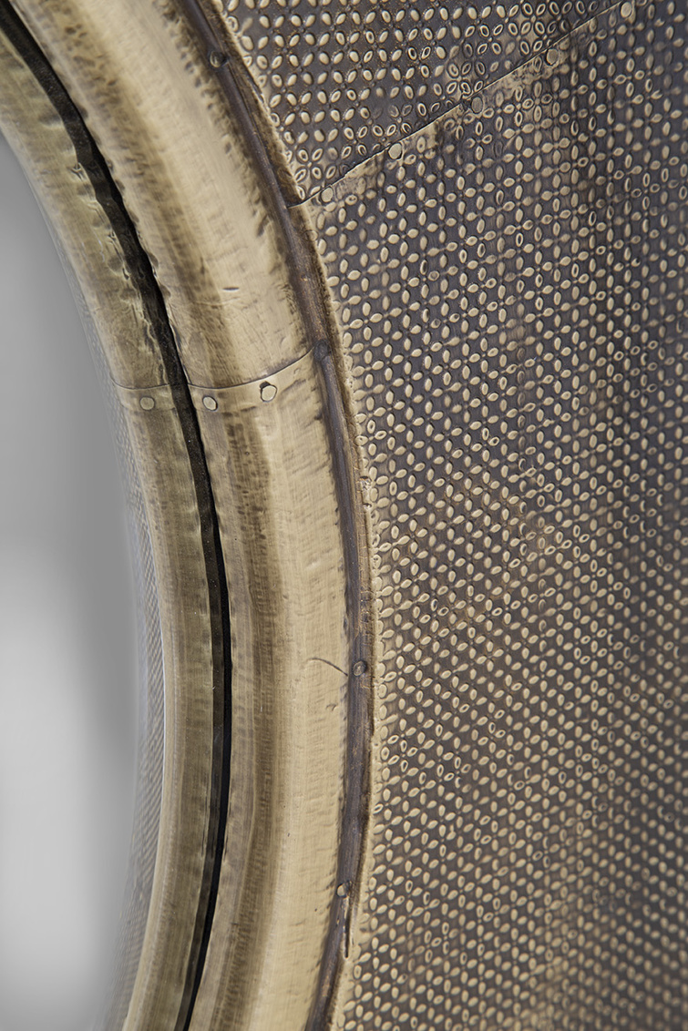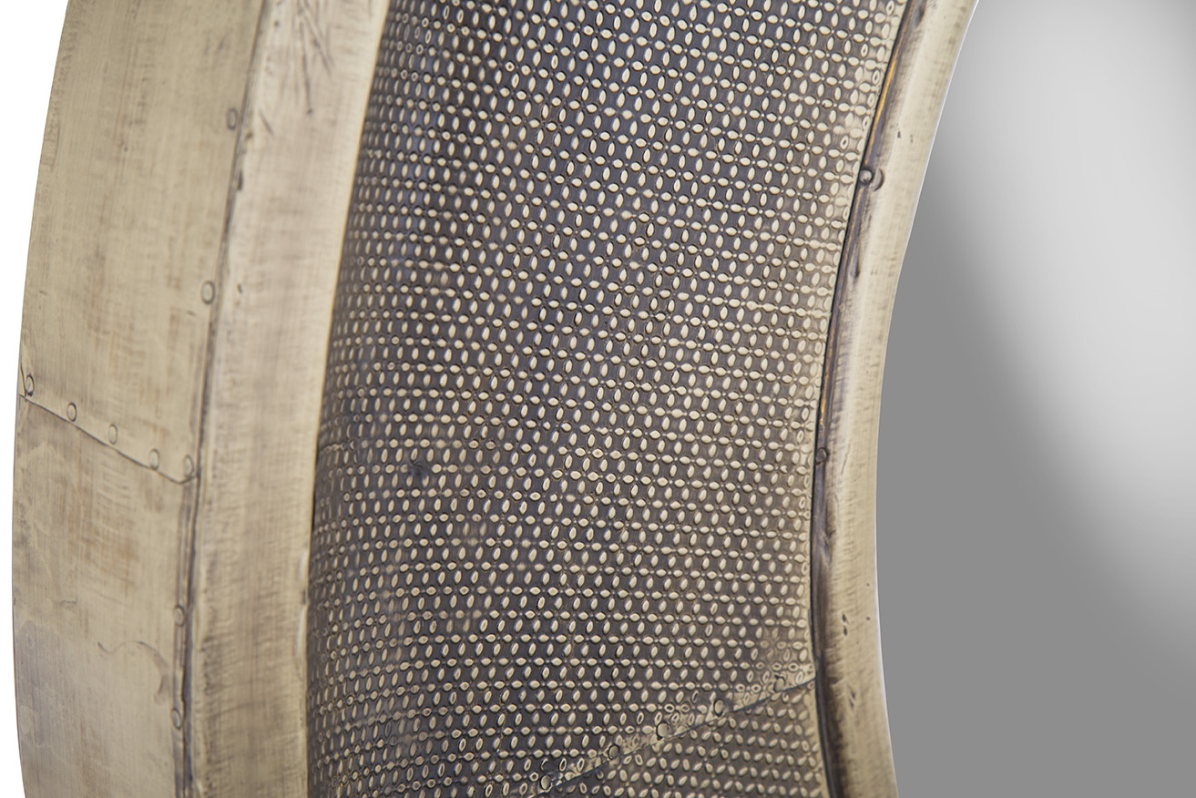 **Final Sale - All Items are sold as is, no returns unless damaged upon receipt. The Lux Large Porthole Mirror is a bold statement piece with a vintage-industrial aesthetic. Its circular design features an antique brass frame with a speckled texture, evoking old-world charm and character. Perfect for adding depth and style to any space, this mirror combines timeless appeal with an industrial edge.