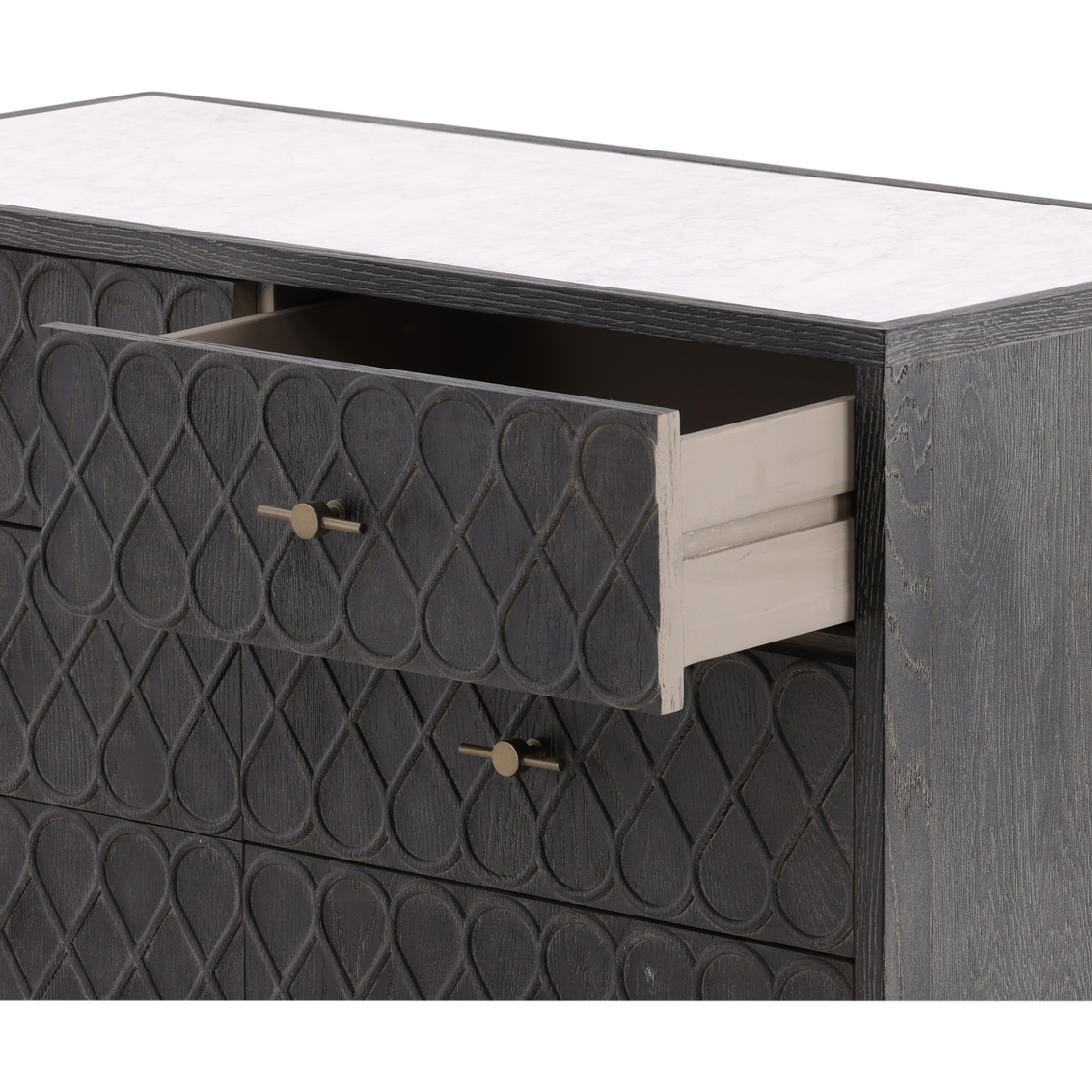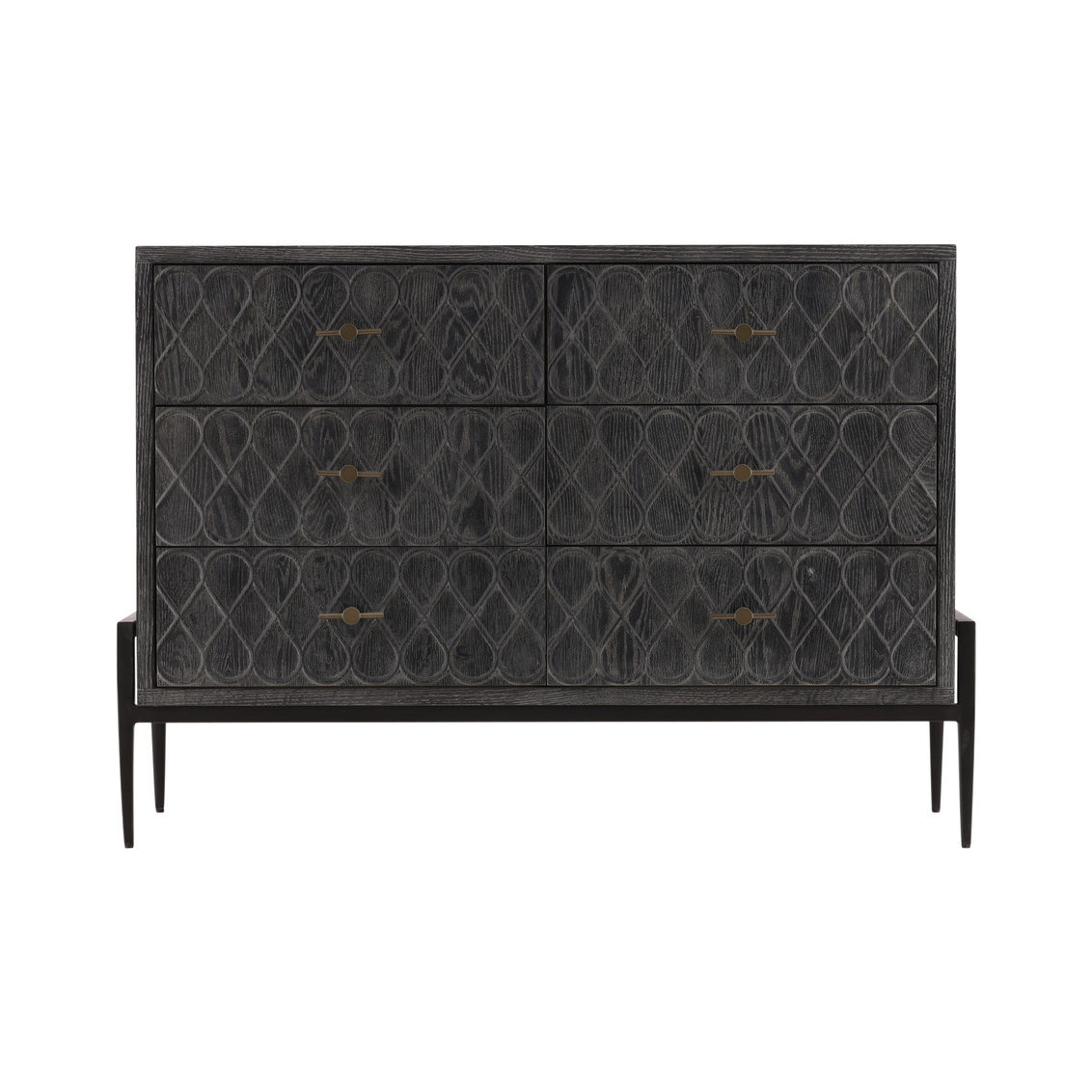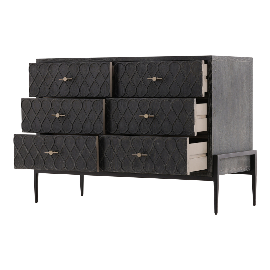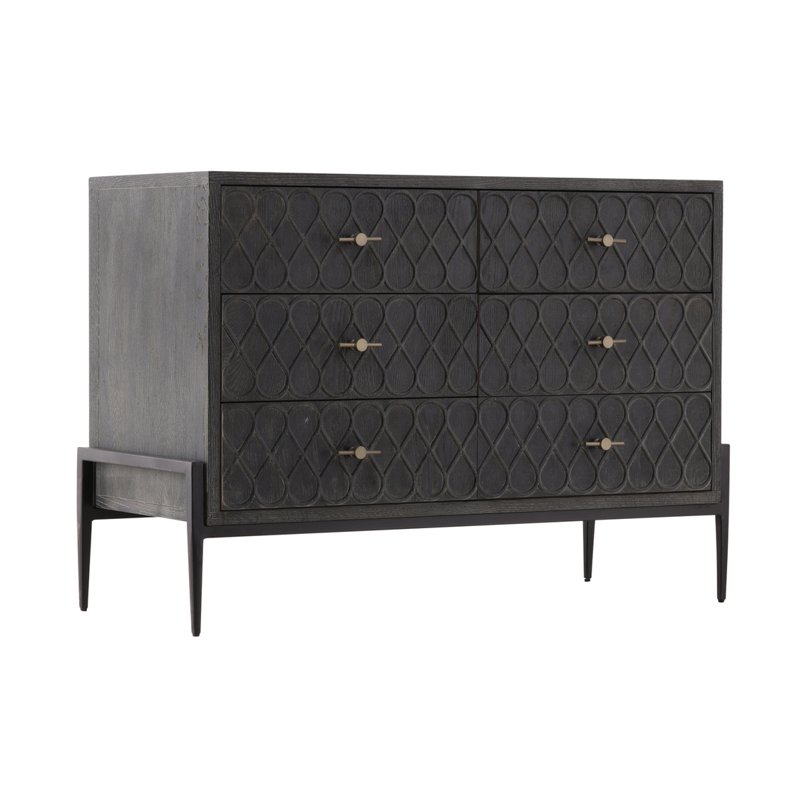 The Stevens Chest exudes sophistication with its blend of Oak, a marble-inlaid top, and a sleek Iron base. Designed for both style and practicality, it features six drawers, offering generous storage space. The combination of the charcoal finished wood, luxurious marble, and industrial iron gives this sideboard a timeless yet contemporary appeal, perfect for any modern home.