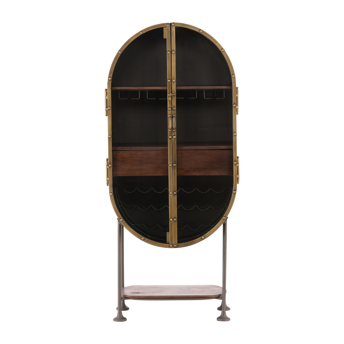 The Eclipse Bar Cabinet features a sleek oval-shaped design crafted from iron and glass. Inside, it offers a wine rack, glass rack, two drawers, and a shelf—perfect for stylish and organized entertaining.