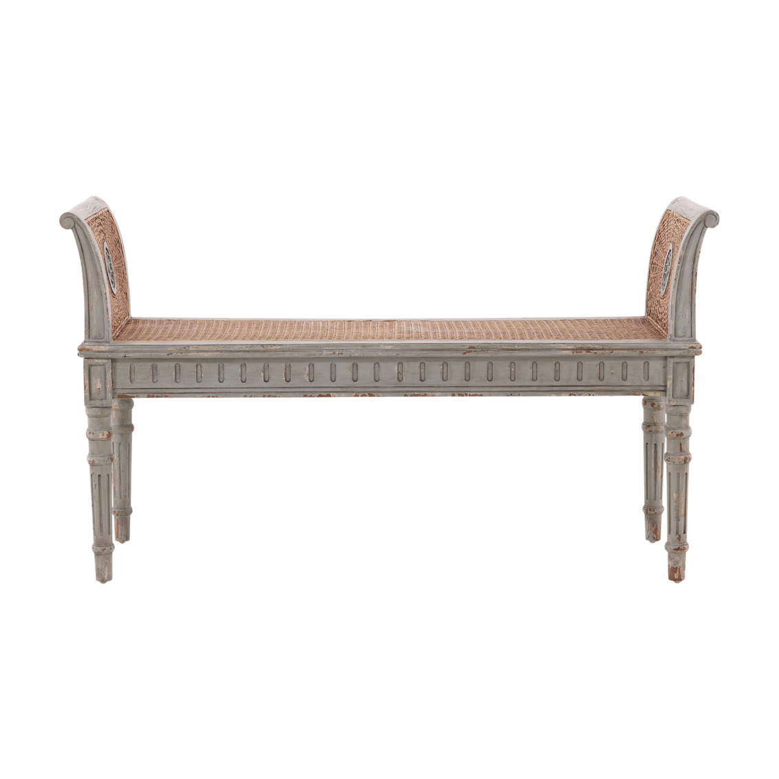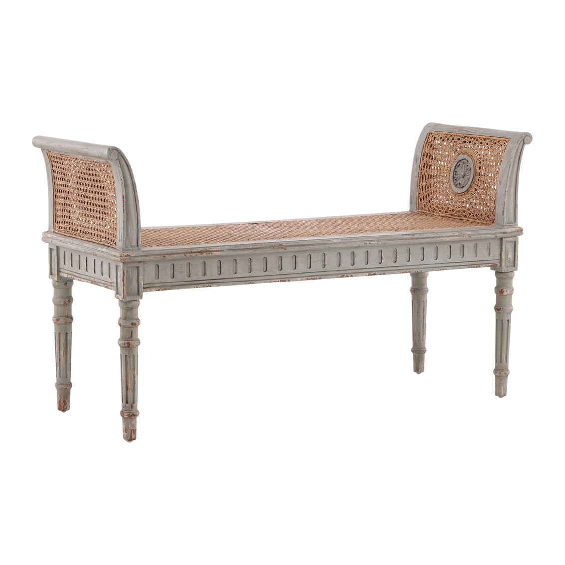The Castlewood Bench is a timeless piece that showcases exquisite craftsmanship and natural beauty. Made from sustainably grown mahogany, it features gracefully hand-carved legs and arms each adorned with intricate wooden flower details in a distresseed greige finish. A tan woven cane seat and double cane panels along the arms add lightness, texture, and comfort while highlighting the bench’s artisanal character. Elegant yet versatile, the Castlewood Bench brings warmth and refinement to entryways, living rooms, or bedrooms.