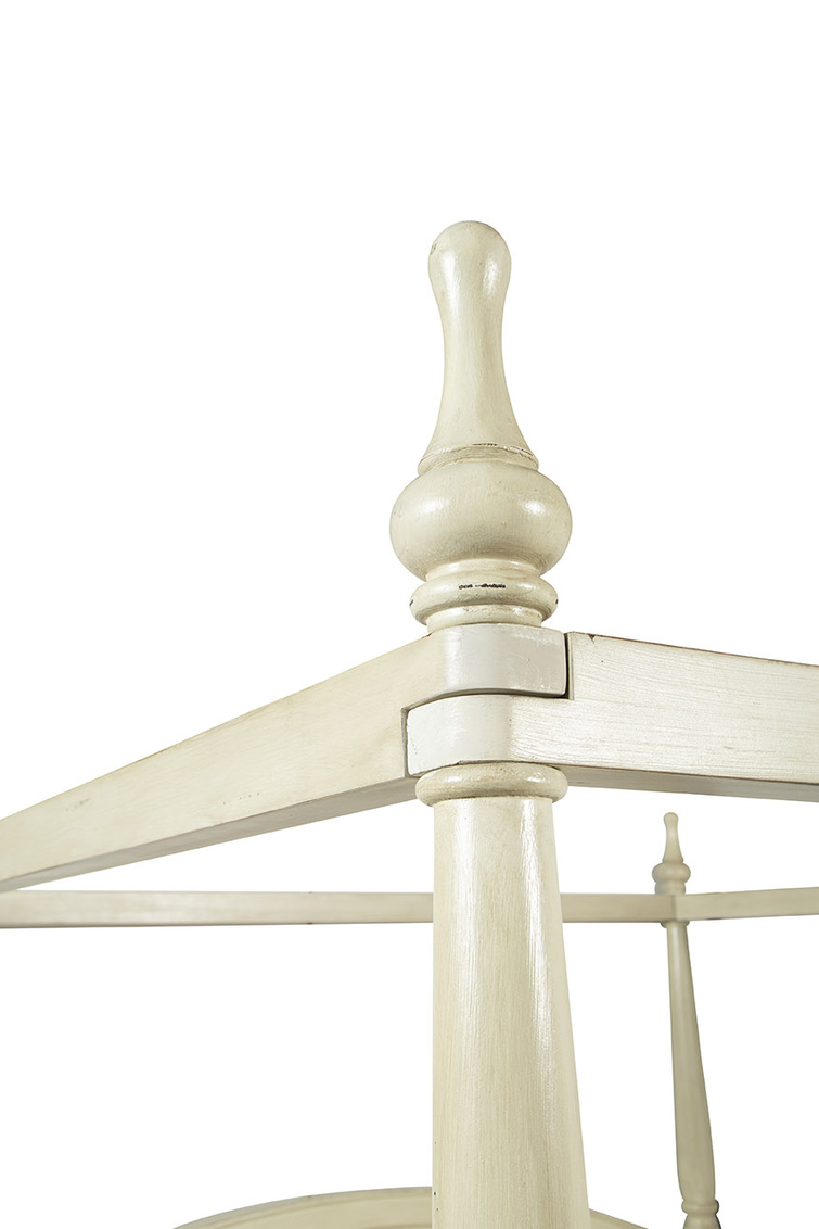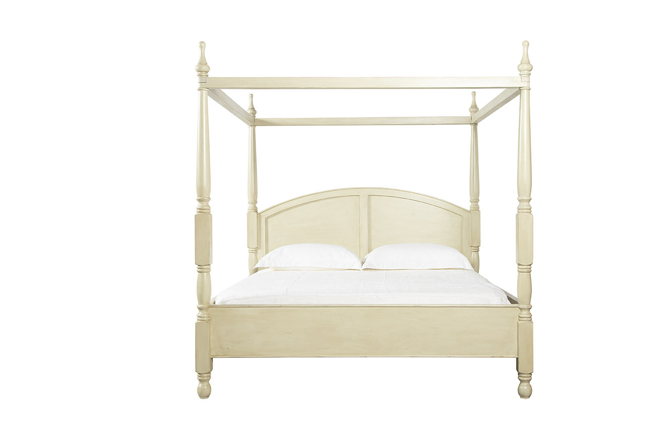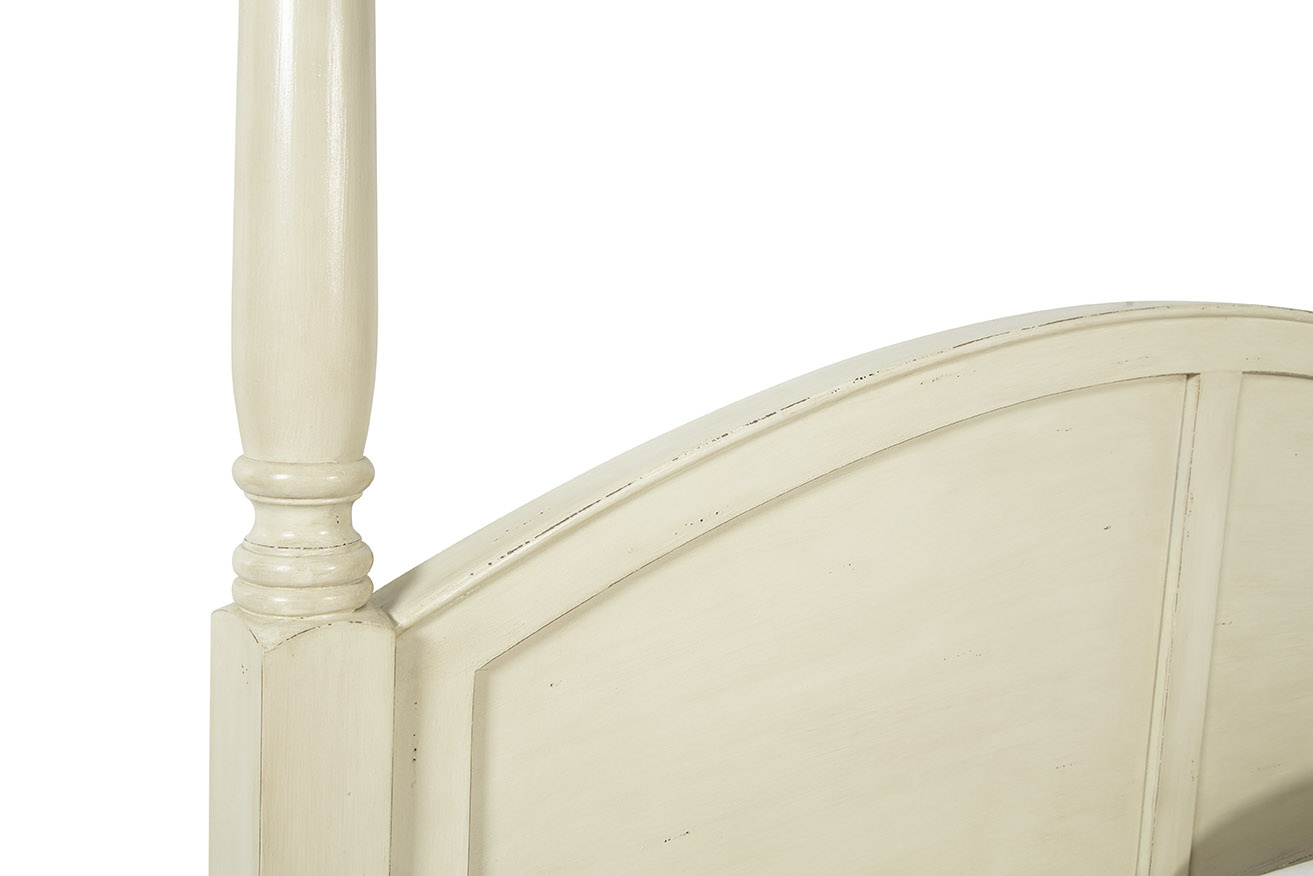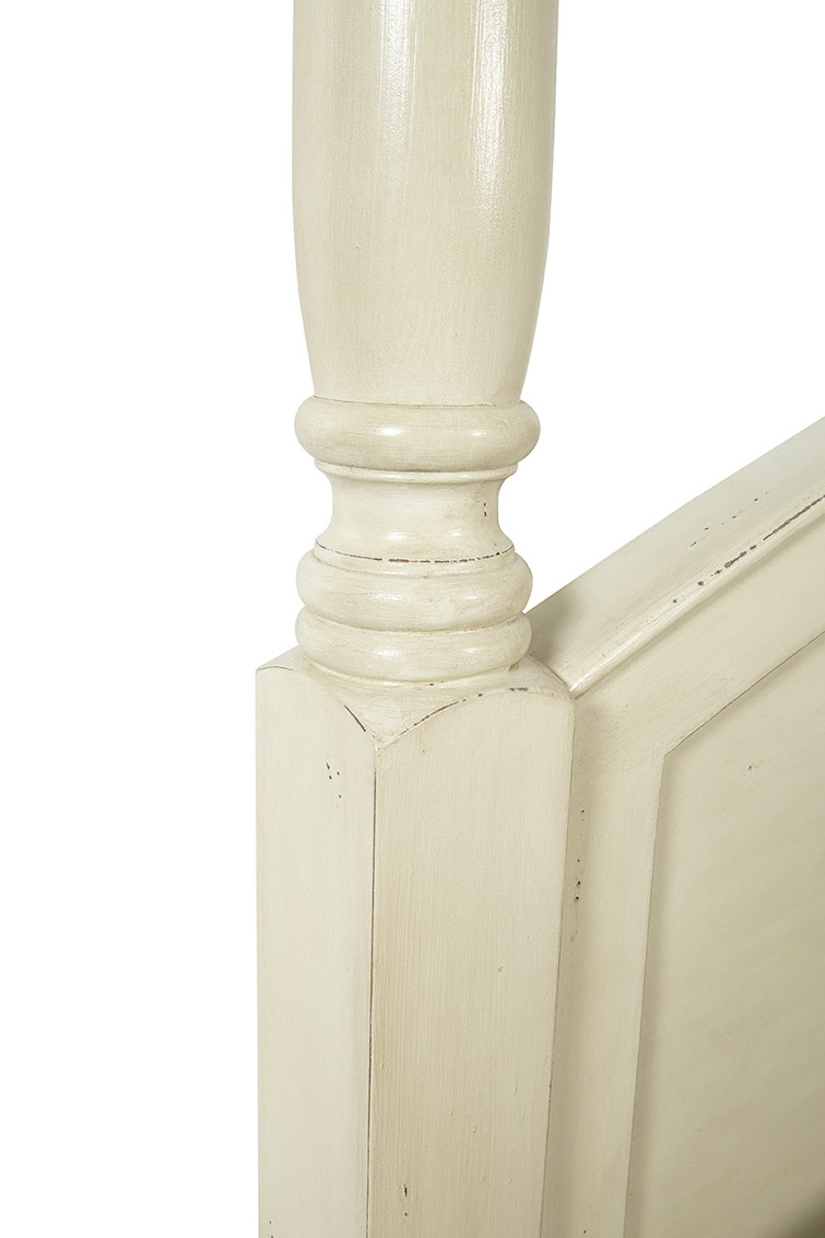 The Wright King Bed is a beautifully crafted four-poster bed made from sustainably grown mahogany and hand-painted in a distressed oyster cream finish for timeless charm. Its arched headboard adds dimension and visual interest, while the turned posts are topped with removable finials, allowing for customizable elegance. Combining artisanal craftsmanship with classic design, the Wright King Bed serves as a refined and inviting centerpiece for any bedroom.