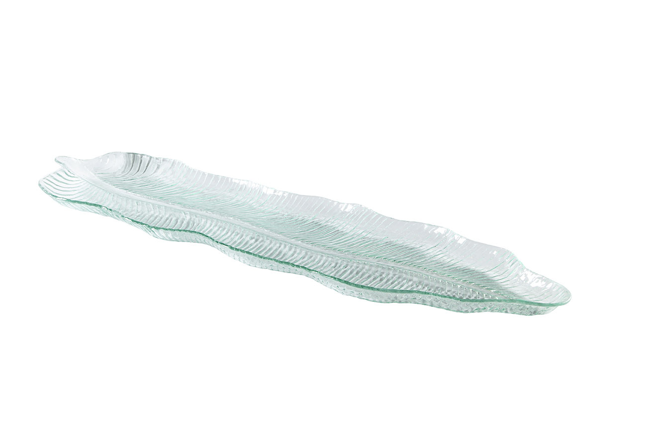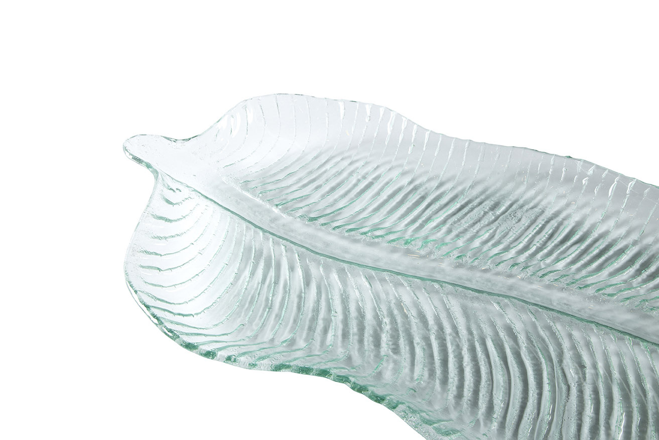 Elegant and organic in design, this Large Glass Platter features a beautifully textured leaf-like pattern pressed into the glass, creating subtle movement and visual depth. Its elongated shape makes it perfect for serving charcuterie, cheeses, fruits, or appetizers, while the delicate green tint and sculpted edges add a refined natural touch to any table.