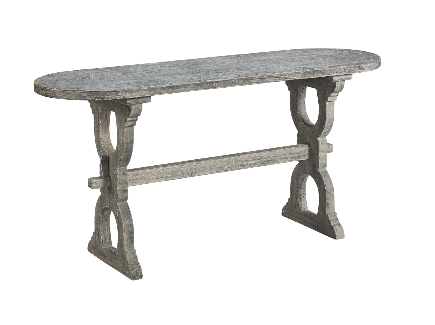 **Final Sale - All Items are sold as is, no returns unless damaged upon receipt. With the simple oval top and lyre shaped base, this lovely console is the perfect way to define space in a large room or to anchor your favorite objects in an entry way. The unique grain variations found in reclaimed pine are enhanced by a soft rubbed gray finish.