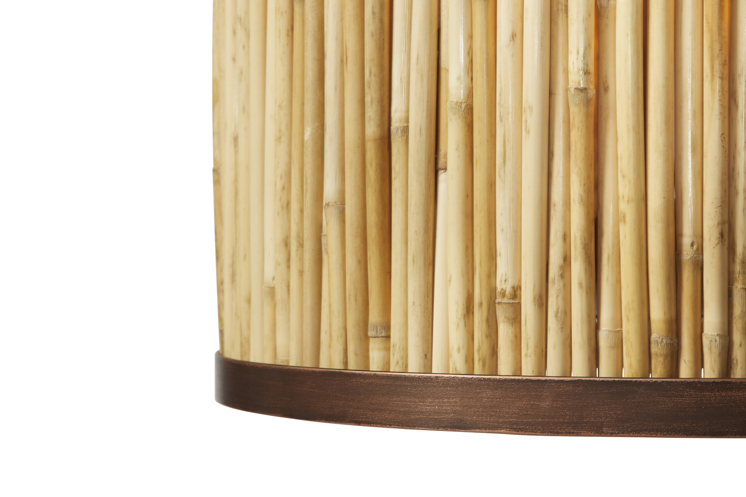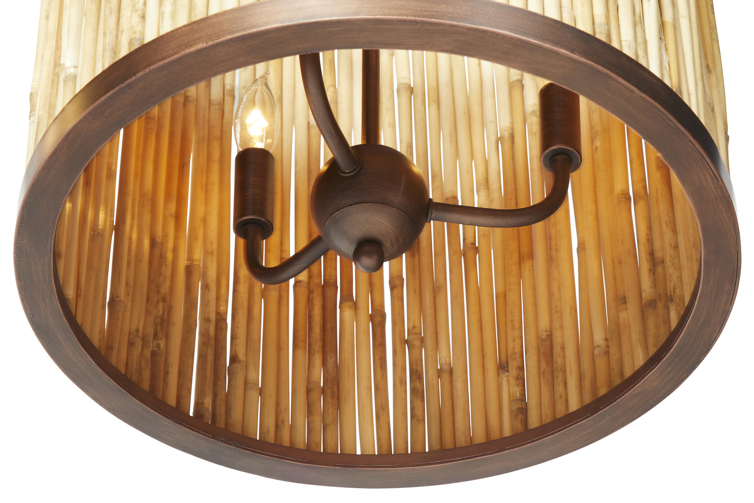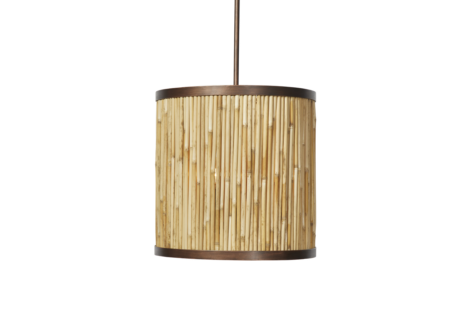 While this smaller drum chandelier is lovely on its own, it is even more striking when used in groupings at different heights, or as pendants over a large island. The pole is adjustable and comes with different length rods. The shade is crafted of natural Kubu reed held in place by rust finished metal bands. A touch of natural texture and tones which is certain to enhance today's neutral palettes.