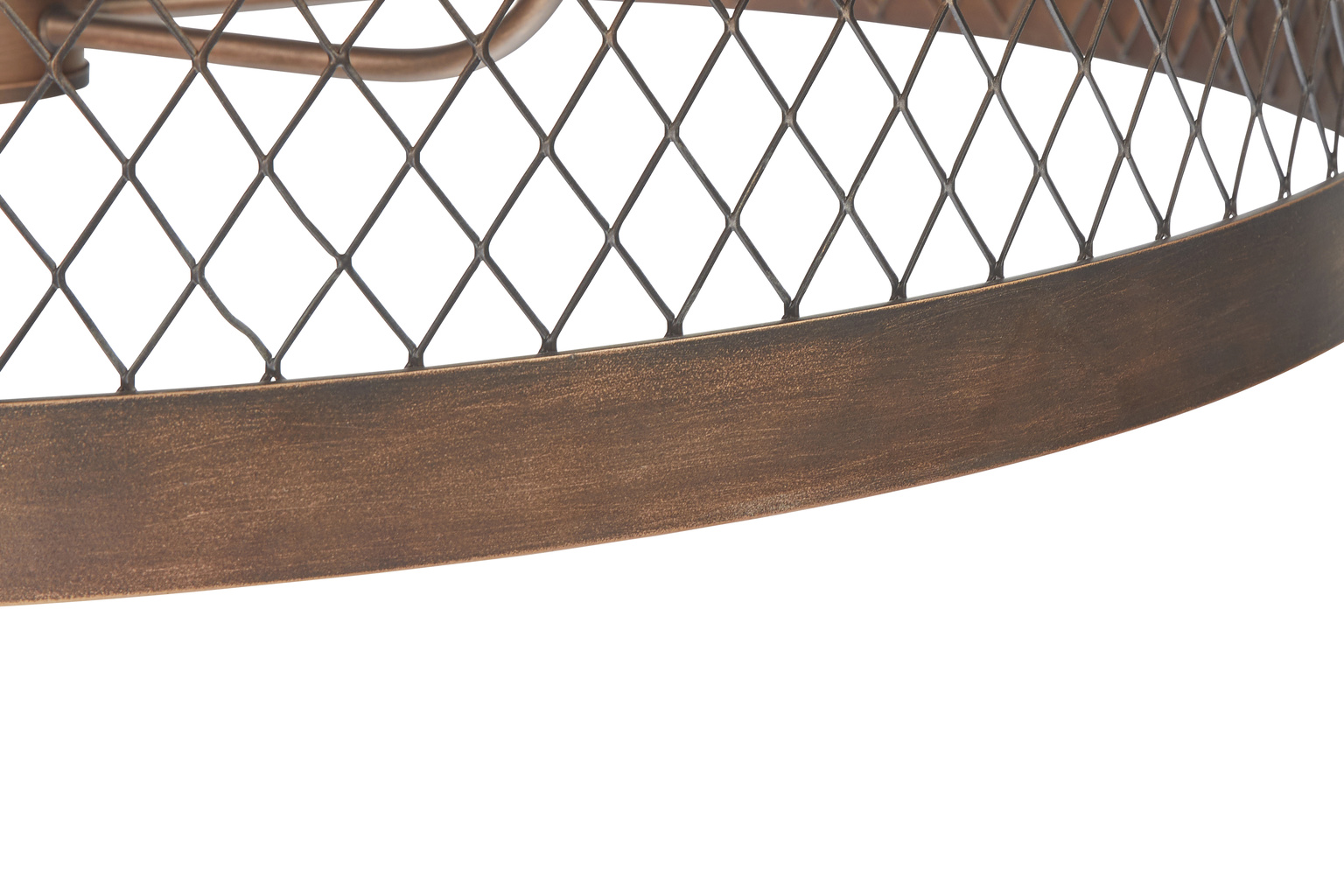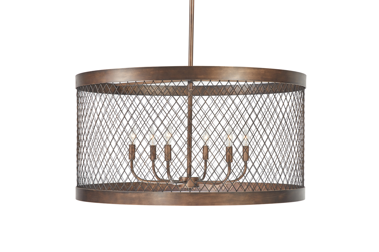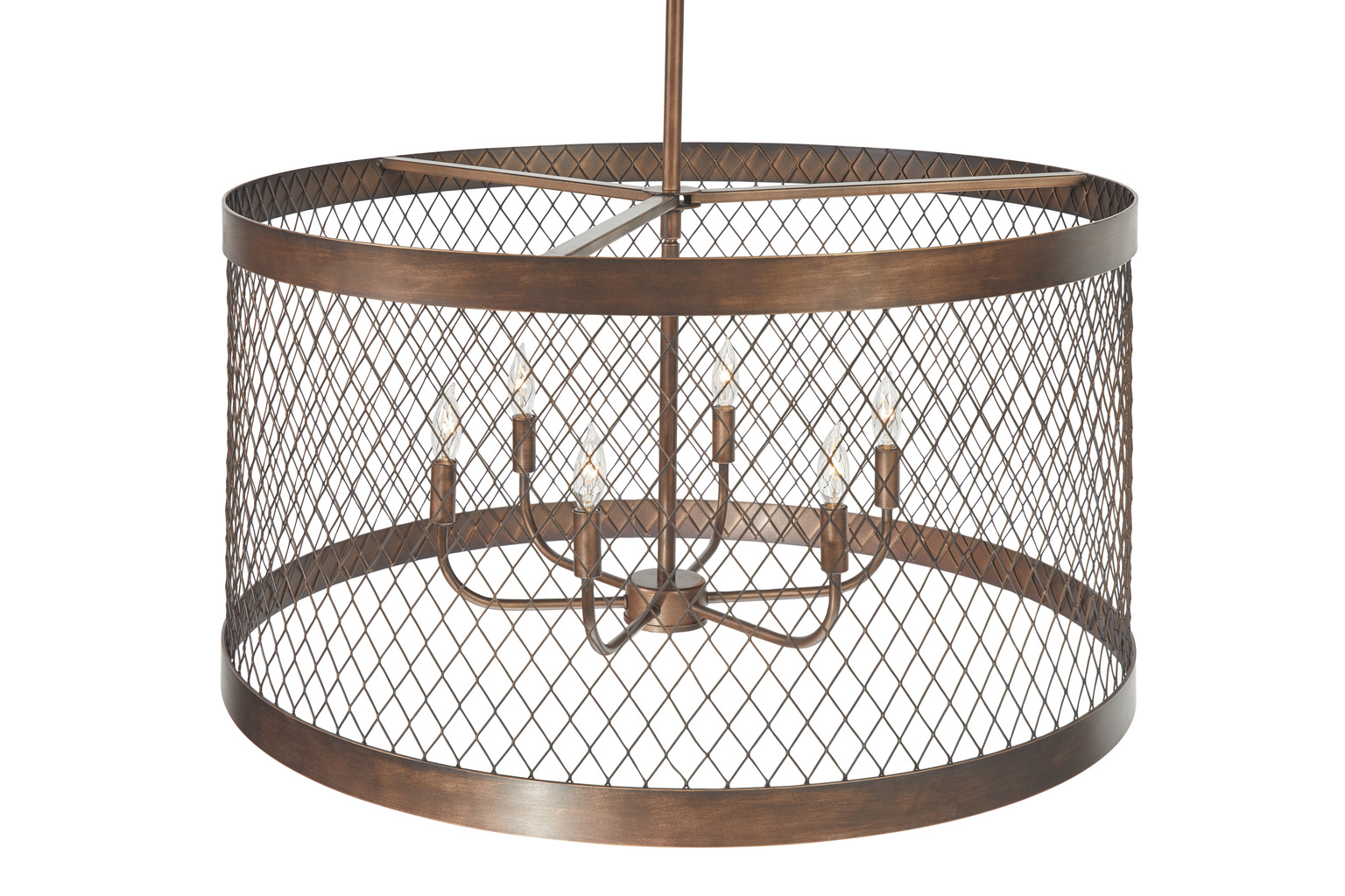 With its warm rusted tones, this six arm chandelier provides stylish visual interest through the use of slender metal wires woven in a diagonal lattice pattern. A handsome choice for any room which needs a touch of eye catching pattern.