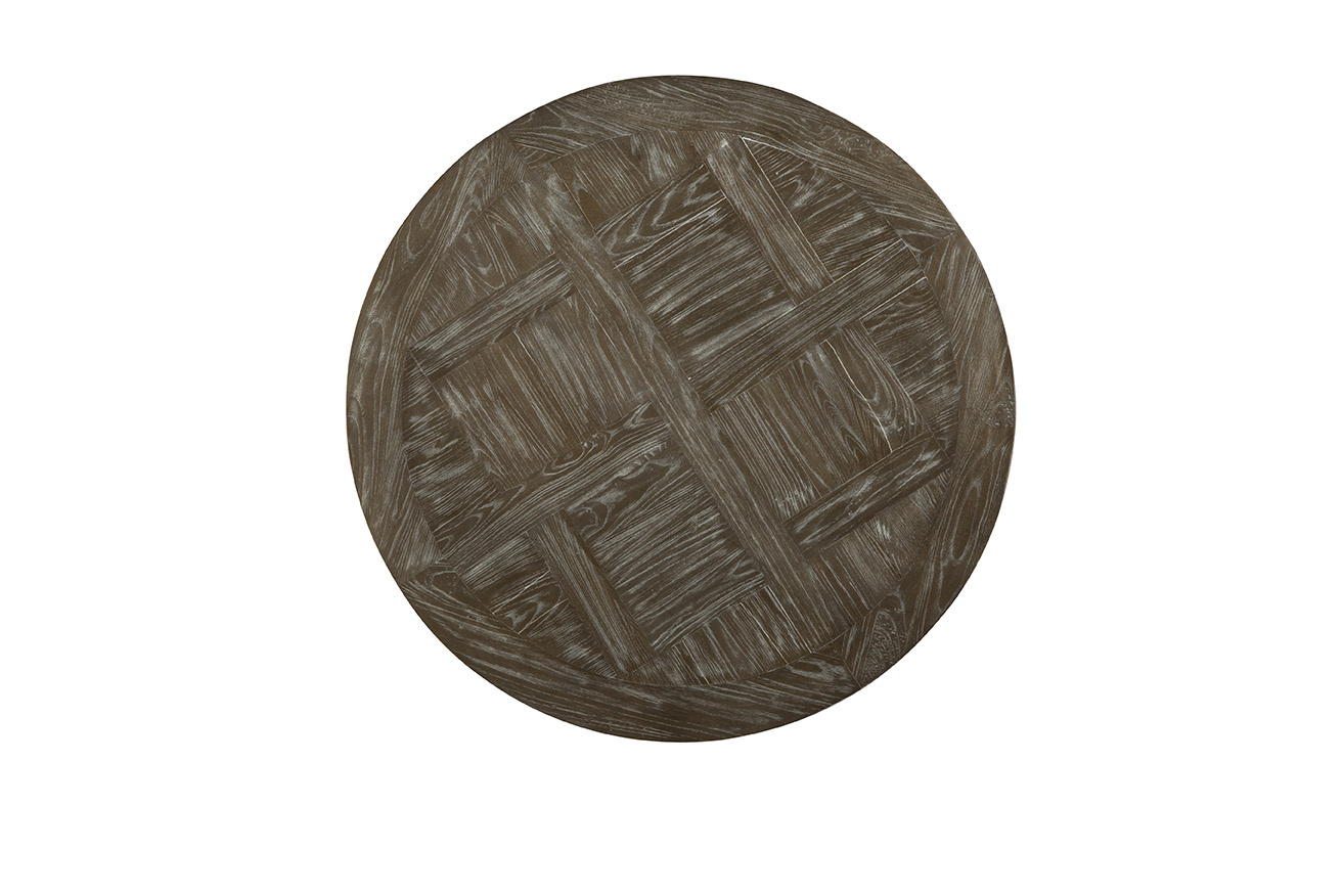 Parquet panels are encircled by a ring of oak on this stylish table made family friendly by the application of a clear coat finish. Looks even better paired with the matching side table, 20-097 and console, 20-098.