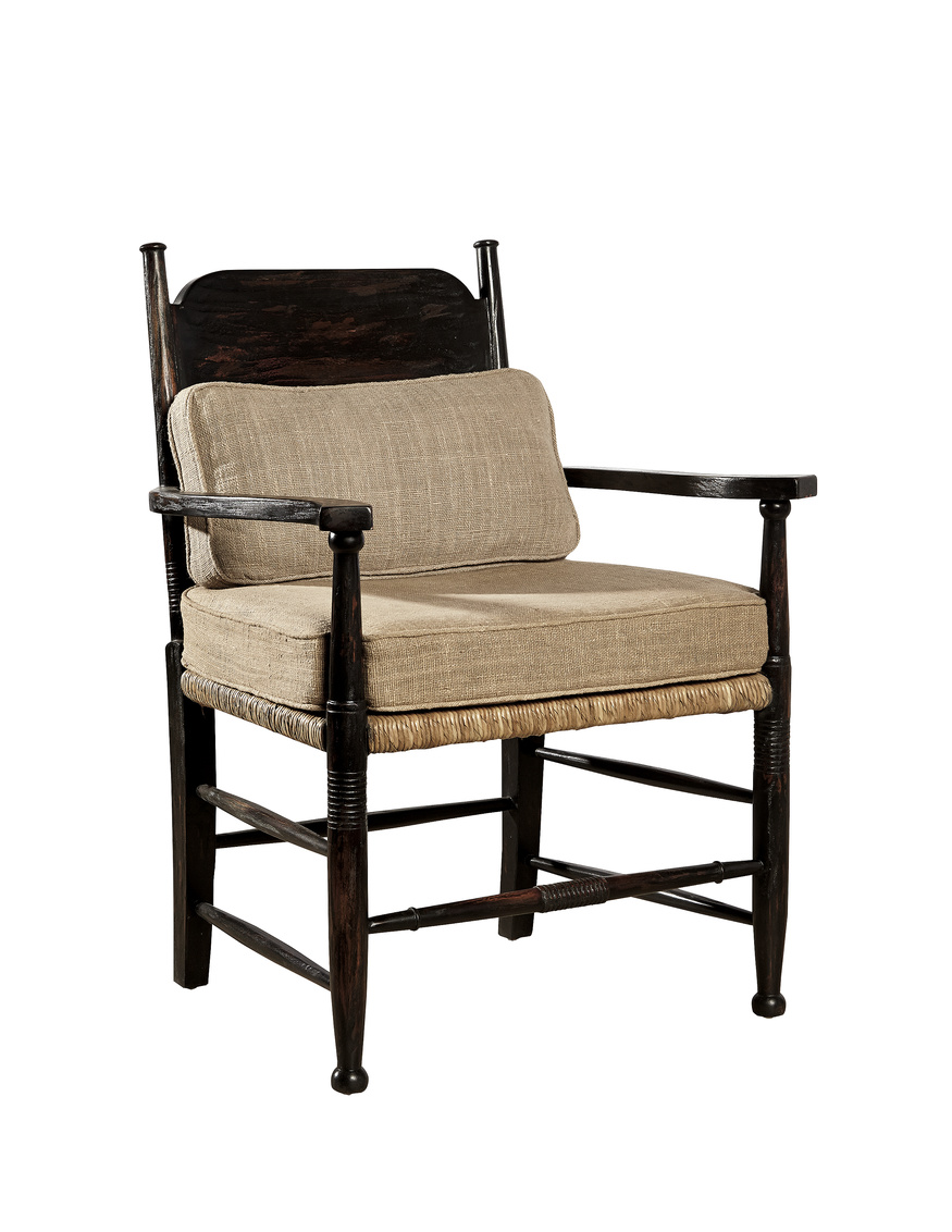 A small footprint, but large scale seating is the hallmark of this mahogany and hand-woven rush seated chair The removable raw silk cushion and the stunning black rub through finish with subtle rust undertones, make for an eye-catching chair for any room