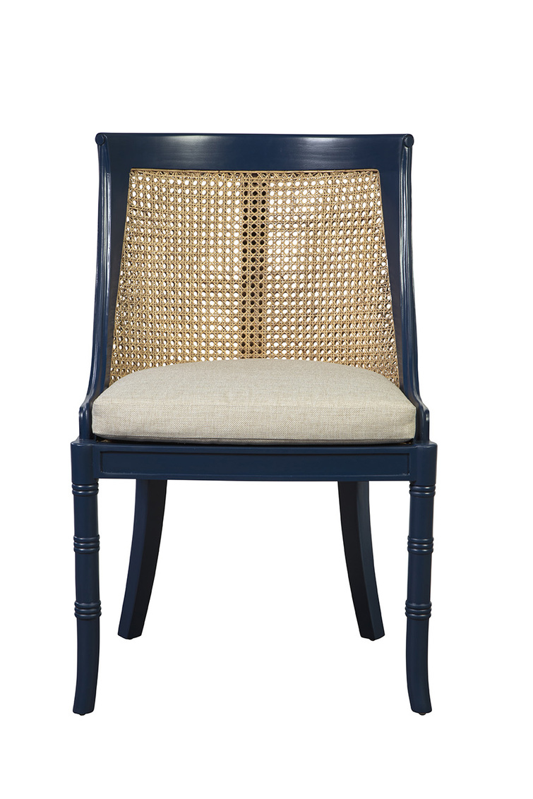 Ever popular, this solid mahogany chair with hand woven double caning on the seat and back has been made even more chic by the use of Parisian Blue lacquer and removable natural linen cushion. Perfect for today’s trending palates.