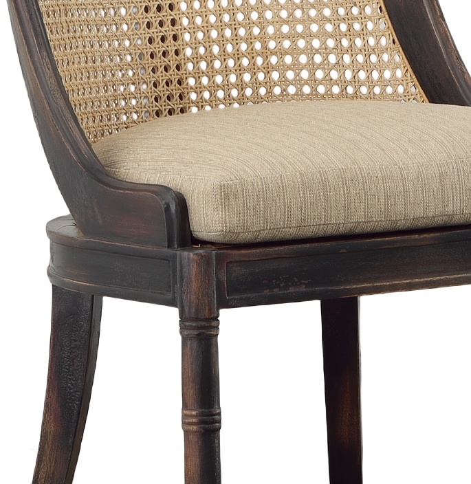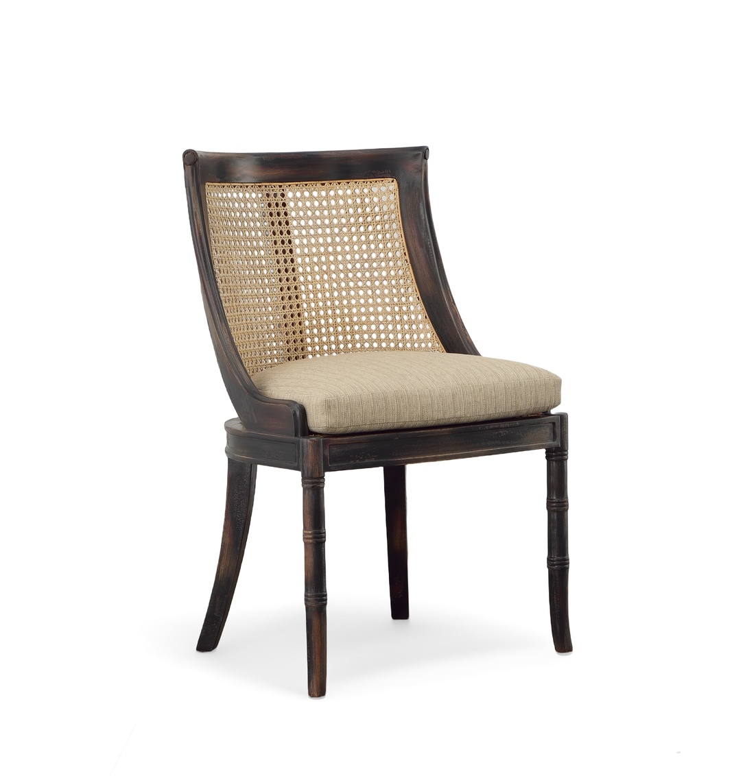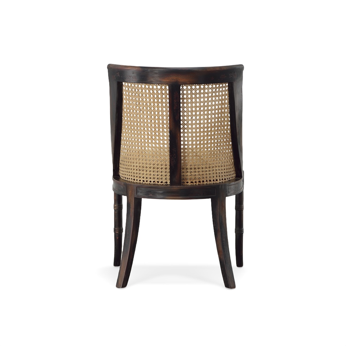 The perfect “pull up” chair, this solid mahogany chair offers great comfort with the double-caned seat and back. The removable raw silk cushion and the stunning black rub through finish with subtle rust undertones, make for an eye-catching chair around any table.