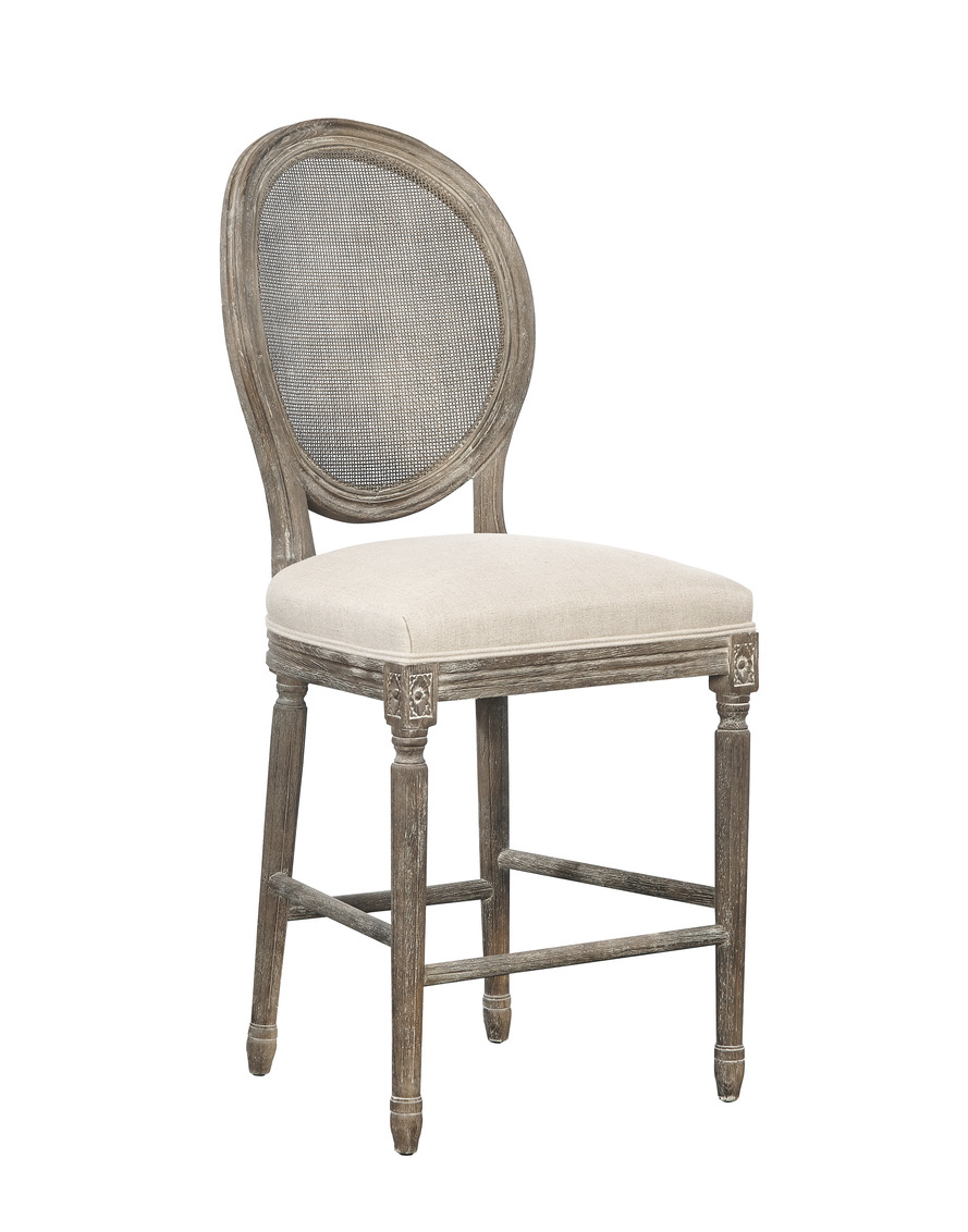 The contrast of woven rattan backs and neutral linen seats pairs beautifully with the soft dry-brushed gray finish of these solid oak, hand carved counter stools.