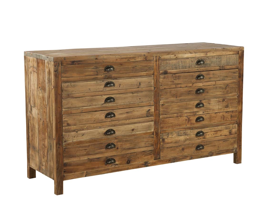 Timeless design is created in solid reclaimed pine, and features cup pulls on the functional dovetailed drawers. Mindful of practicality, the top row of drawers is shallow, while the rest of the cabinet features 6 double depth drawers useful for storing everything from linens to toys!