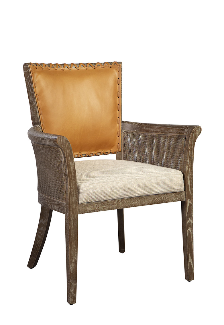 Gently flared lines make this oak arm chair is interesting enough to use on its own, or at the head of e arms, and the warm caramel tones of the hair on hide and top grain leather add fashionable contrast. Whether used for dining or engaging conversation, the neutral box seat cushion provides plenty of comfort.