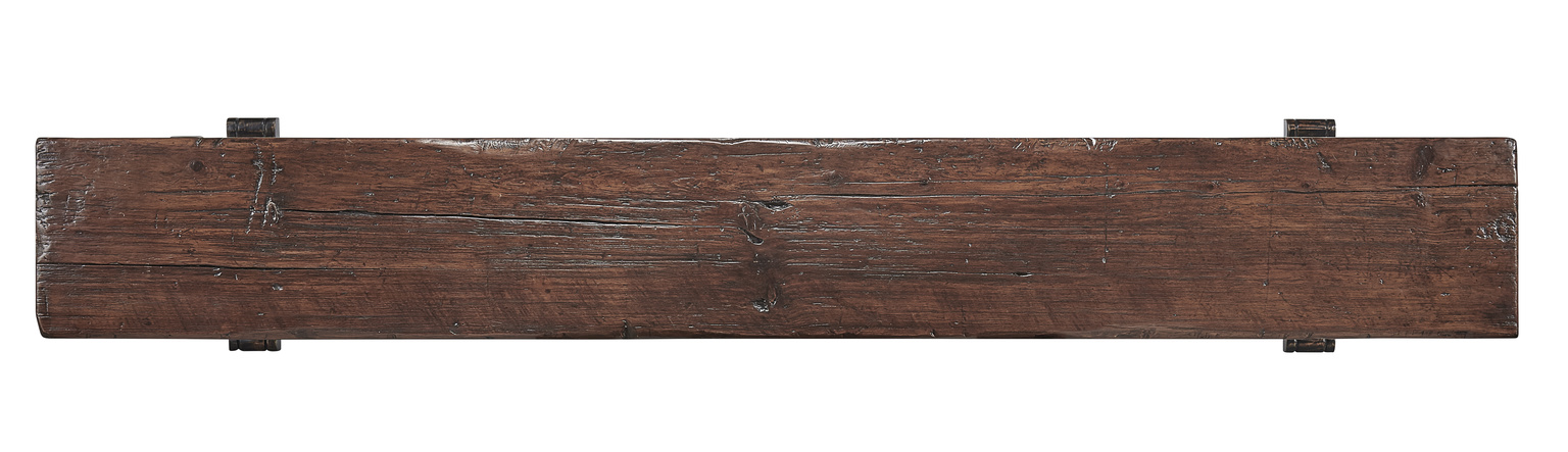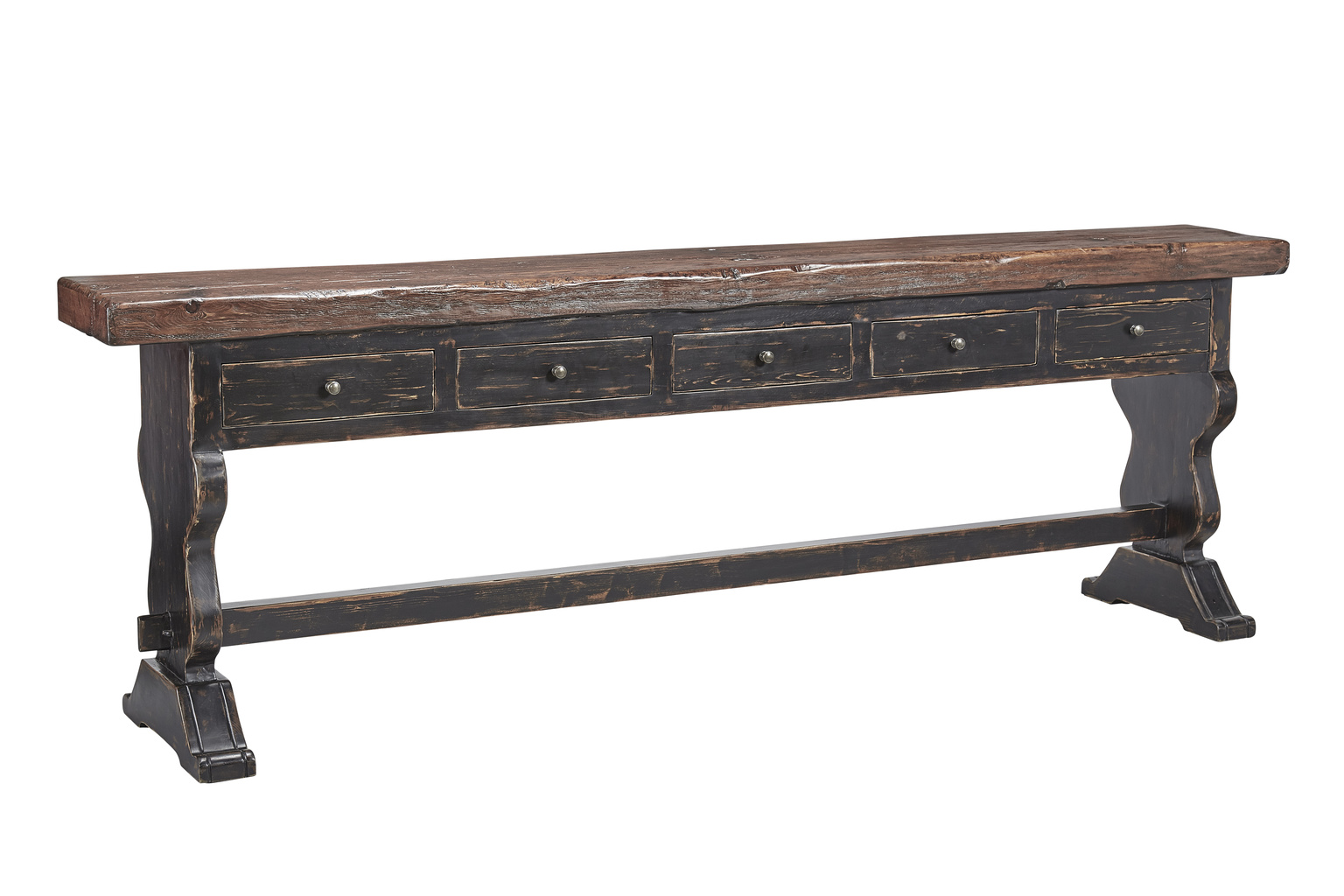 Stretching to an eye-catching length, and supported by unique solid lyre shaped trestles, this handsome server is crafted from reclaimed pine. Boasting a physically distressed finish hinting of countless years of loving use, this beauty has a rubbed black base and a warm brown top. Perfect for those immense TVs or for anchoring a treasured work of art, this handsome beauty has five drawers; making it both stunning and practical.
