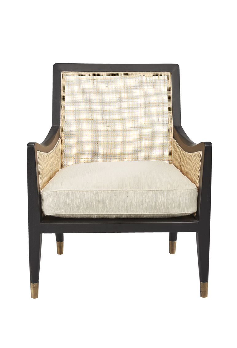 Crafted of solid mahogany with an ebony finish, this sleek chair features double layers of woven cane on its sides and a single layer on the back. The cushion is a neutral slubbed upholstery. Scooped arms and the gently slanted back provide comfortable seating; and the tapered legs end in golden ferules. Perfect for where ever you need stylish and small scaled seating.