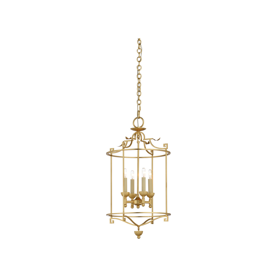 Gold leaf over iron with a subtle key design makes this chandelier perfect for all.